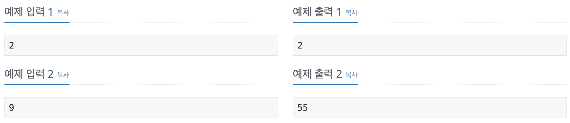 2×n 크기의 직사각형을 1×2, 2×1 타일로 채우는 방법의 수를 구하는 프로그램을 작성하시오. 아래 그림은 2×5 크기의 직사각형을 채운 한 가지 방법의 예이다.