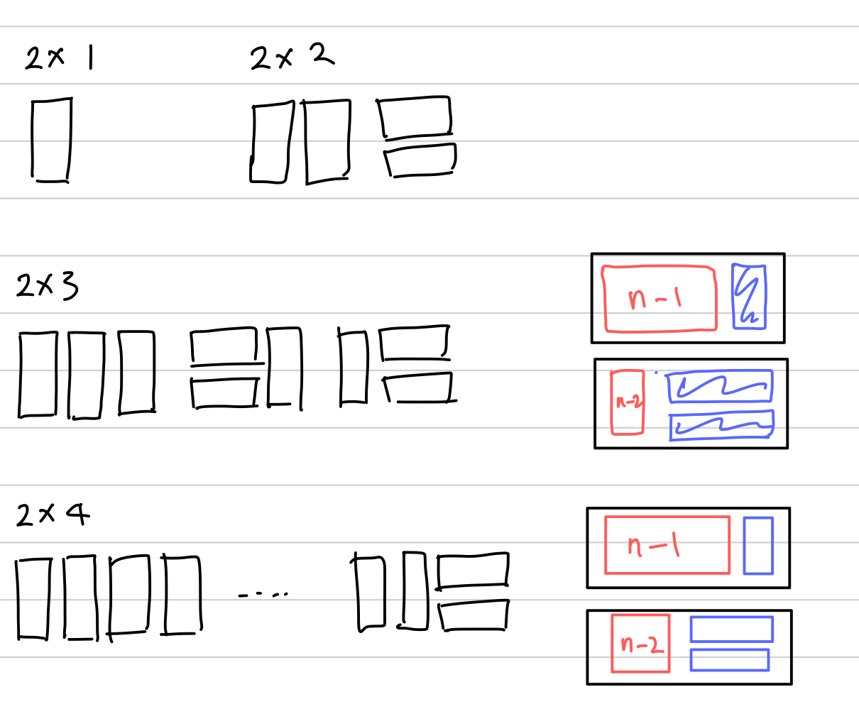 2x3부터 패턴을 잘 살펴보시면 되는데 아래 그림의 오른쪽 색상으로 표시한 직사각형을 살펴보면 우측에 2x1 타일이 들어갈 경우와 2x1 타일 2개가 들어간 패턴을 확인할 수 있습니다. 2x1 타일을 우측에 배치했을 경우 n-1의 결과값과 같고, 1x2 타일을 우측에 배치했을 경우 n-2 결과값과 같은 점을 캐치했다면 DP로 구현할 수 있음을 알 수 있습니다.