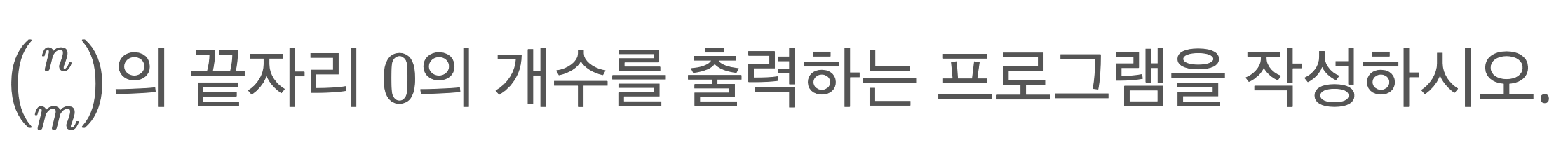조합 nCm의 끝자리 0의 개수를 출력하는 문제 2의 승수(a1 - b1, c1) 와 5의 승수(a2 - b2 - c2) 가 구해졌으면 겹치는(짝지을 수 있는) 개수를 구하면 되므로, 2와 5의 승수 중 최솟값을 출력
