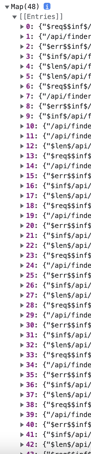 아래와 같이 useSWRConfig를 통해 캐시된 key들을 살펴보는 와중에 useSWRInfinite의 경우 캐시키로 $inf$를 가지고 있음을 확인할 수 있었습니다.