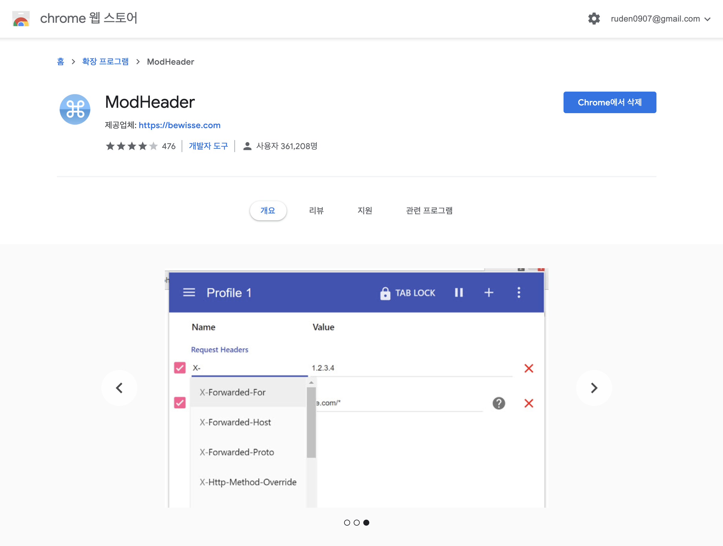 ModHeader는 Chrome Extension으로 아래와 같이 다운받아서 바로 사용하시면 됩니다.