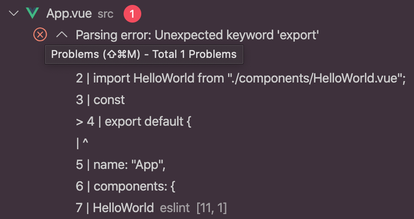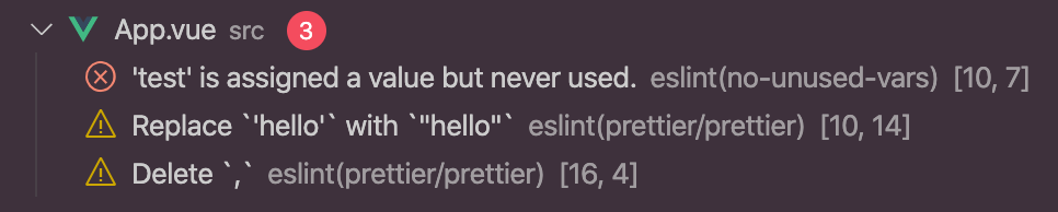 Vue 파일에서 강제로 에러를 내거나 경고를 내보면 VSCode Problem에서 정상적으로 에러와 경고 메시지를 내고 있음을 확인할 수 있습니다.