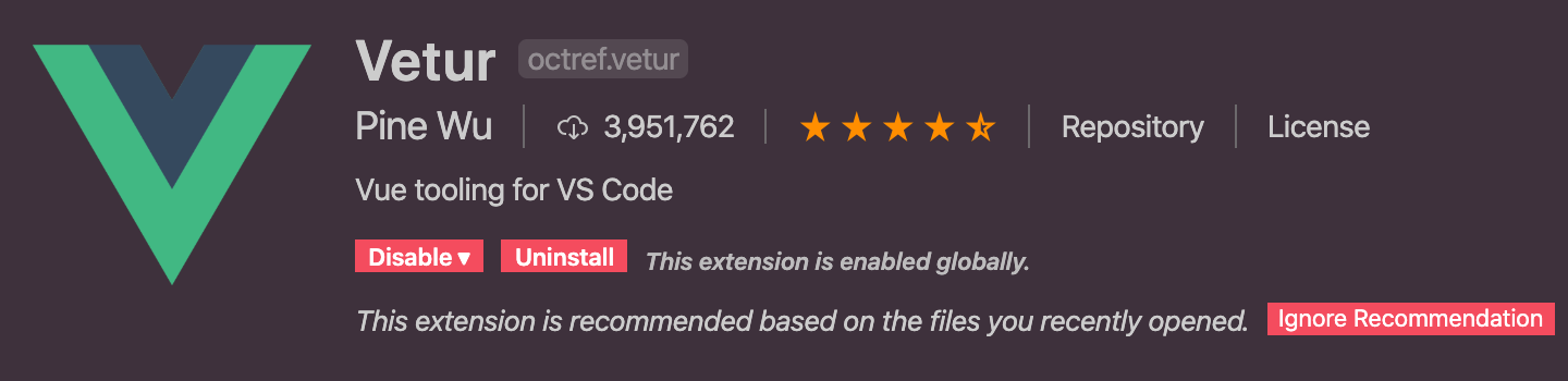 몇가지 VSCode 확장 프로그램을 설치해야되는데 우선 Vetur를 설치합니다. Vetur는 여러가지 기능을 내장하고 있는데 가장 중요한 기능 중 하나는 code highlight를 지원해주는 것입니다. 아래와 같이 Vetur가 어떤 기능을 하는지 확인할 수 있습니다.