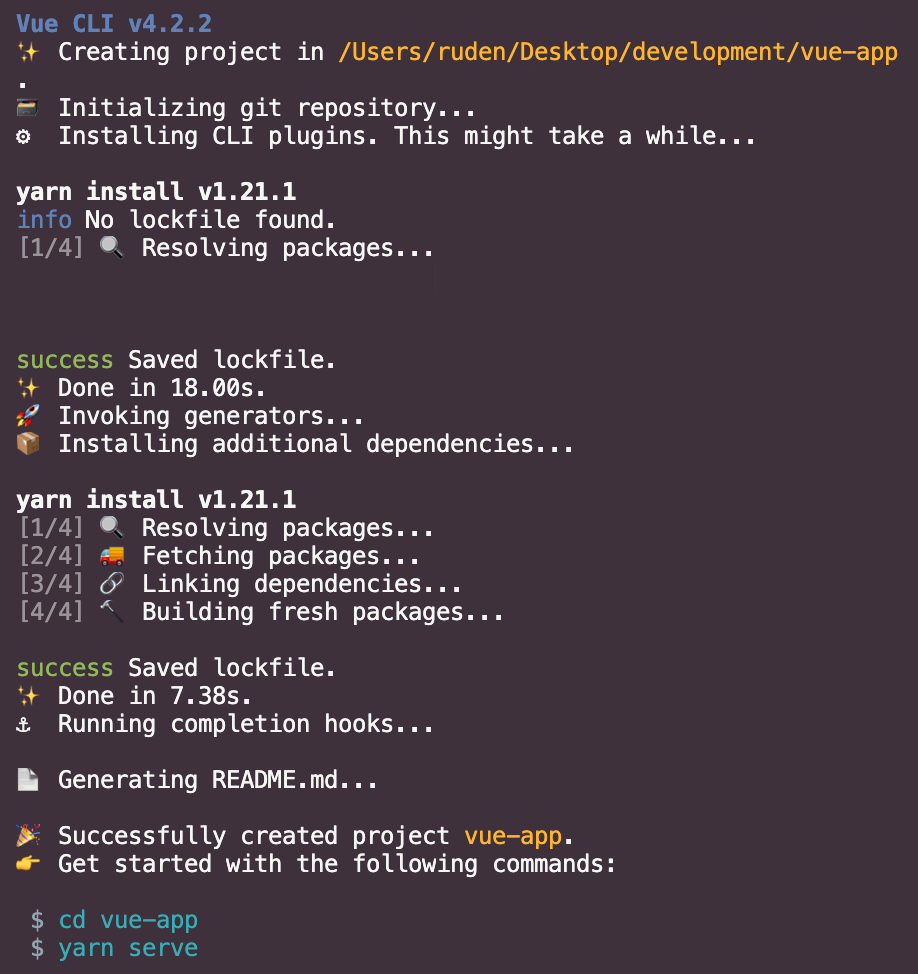 모든 선택사항들을 체크하면 Vue Application을 설치하기 시작합니다. 프로젝트가 성공적으로 생성되었습니다!