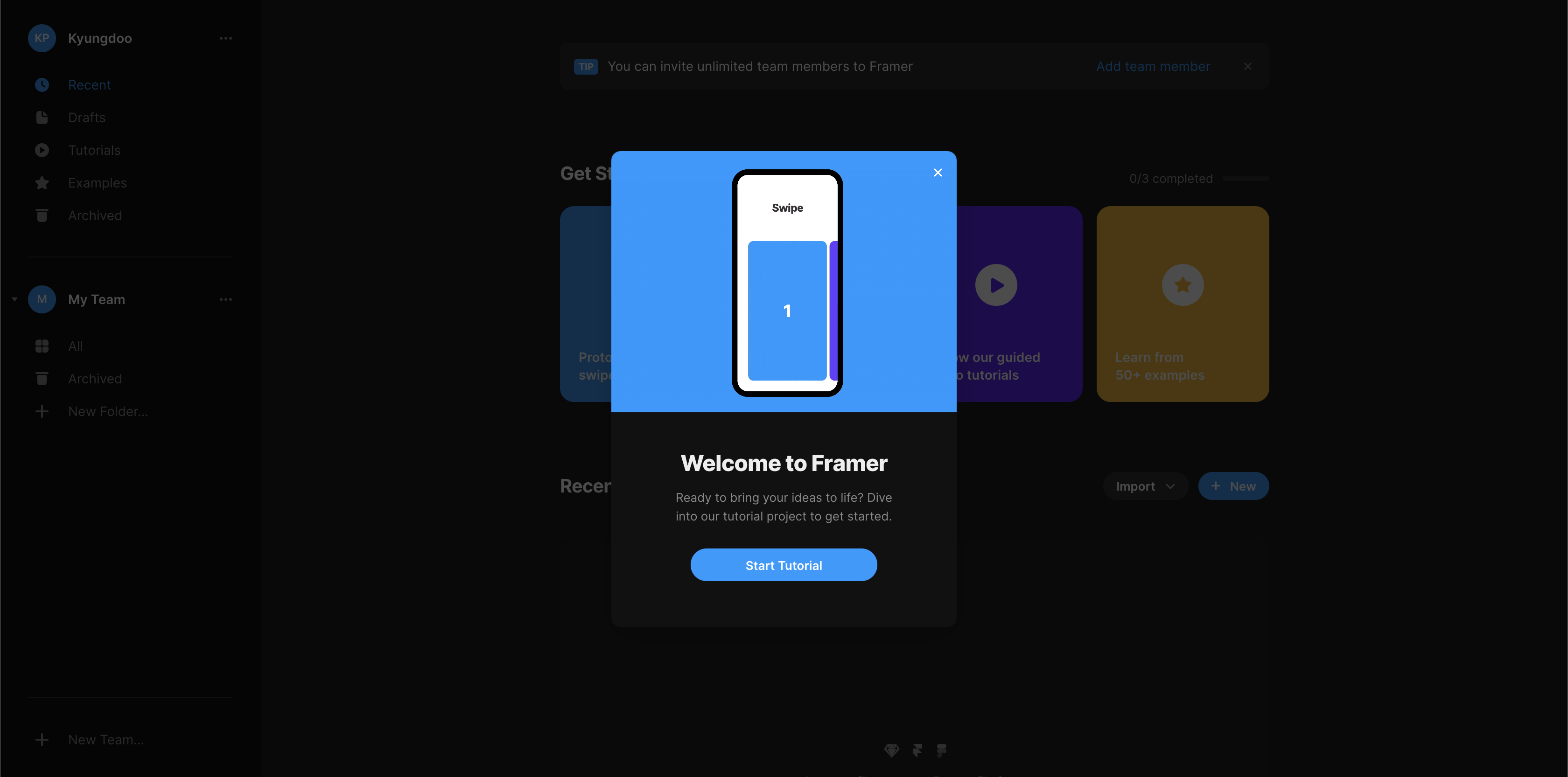자 Framer를 한번 시작해봅시다! 우선 시작하려면 Framer를 가입해야겠죠?