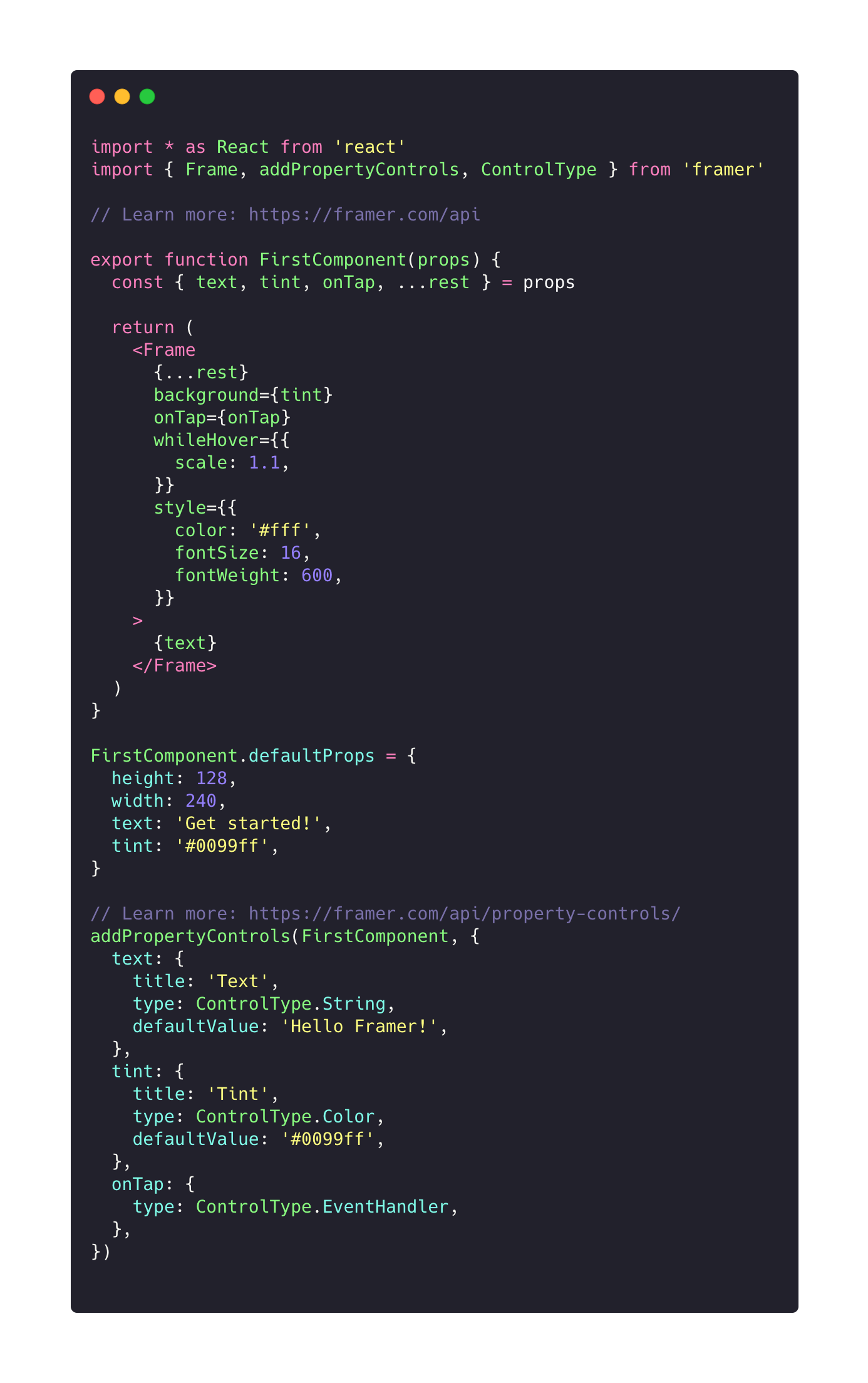 Frame 컴포넌트에 width, height, background가 있는 게 보이시죠? 그 말은 즉슨 Frame이라는 컴포넌트를 만들 때 width, height, background라는 값을 받아서 뭔가를 하겠다는 의미입니다. 우리는 framer에서 제공해주는 Frame이라는 컴포넌트를 사용하는 것이니까 Frame 컴포넌트에서 저렇게 컴포넌트를 만들어 놨겠죠. 단순하게 제공해주는 Frame 컴포넌트를 예시로 들자면 아래와 같을 것입니다.