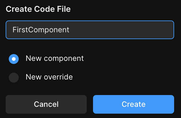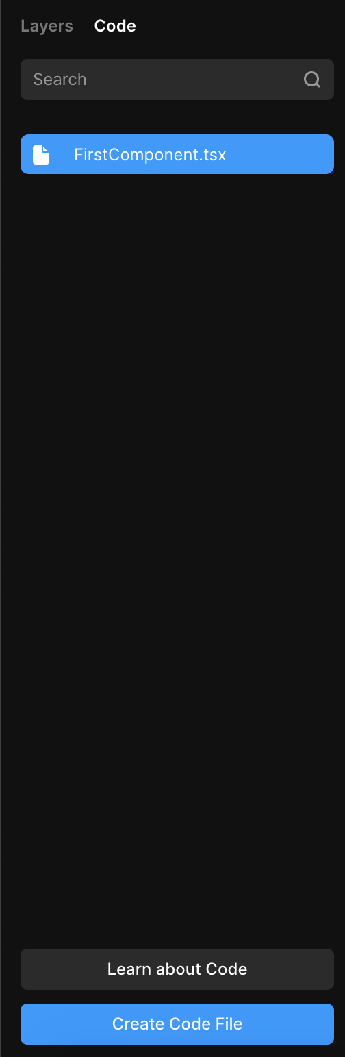 아래 이미지 좌측 패널에 Layouts와 Code 탭이 있는데 Code를 선택하면 탭이 전환되어 컴포넌트의 목록을 보여주고 코드를 생성할 수 있는 버튼이 활성화됩니다. 아래 Create Code File을 선택해서 코드를 생성해봅시다.
