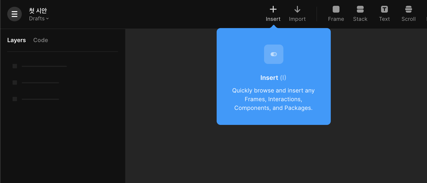상단의 Insert를 누르면 여러 가지 컴포넌트, 패키지, 인터렉션 등 다양한 기능들을 삽입할 수 있습니다. 저희는 디바이스 레이어를 삽입하도록 해볼게요.