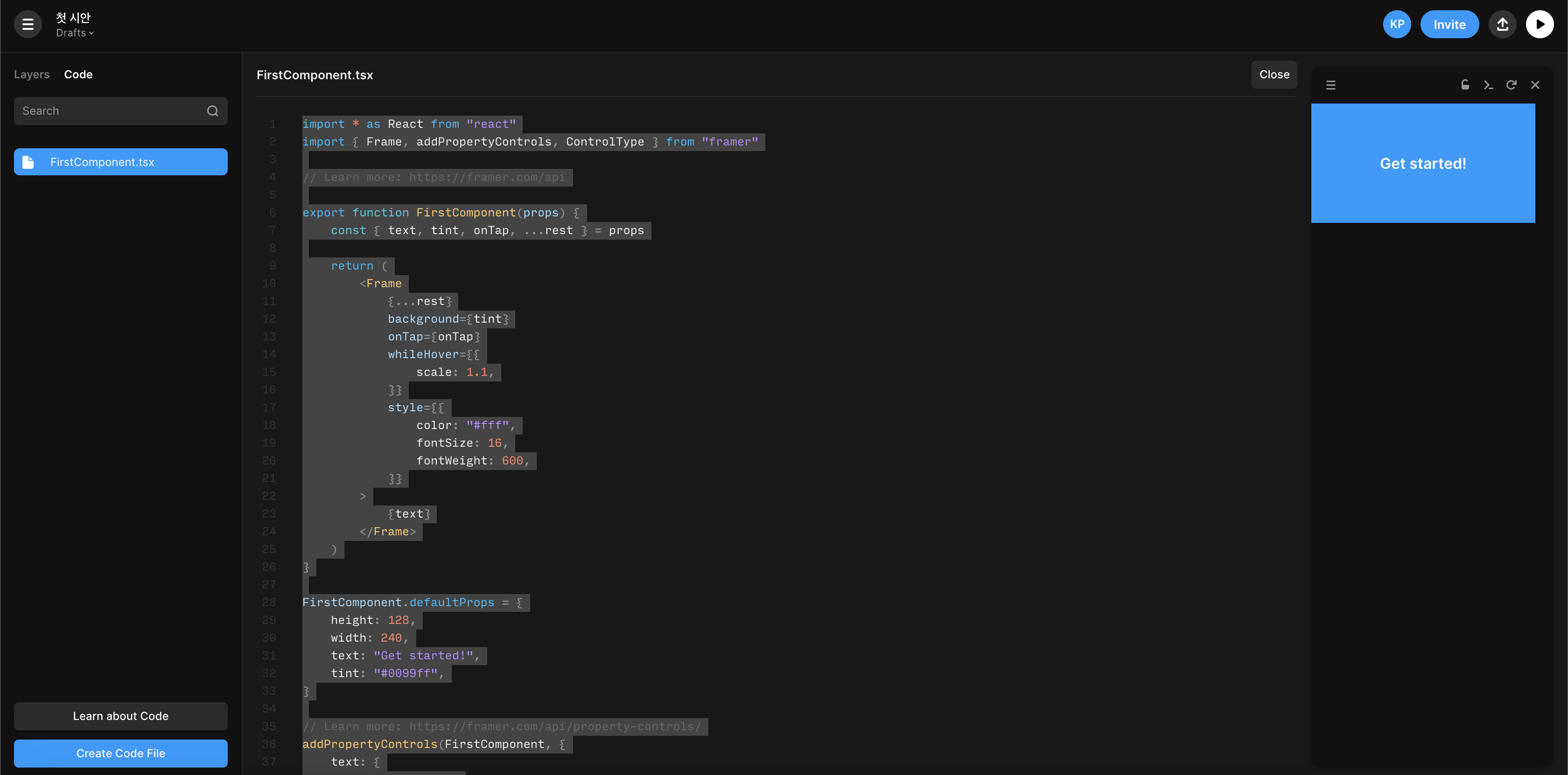 컴포넌트 내부 코드를 보면 굉장히 복잡한 것처럼 보입니다. 하지만 여러분은 지금 이걸 다 이해하실 필요가 없습니다. 왜냐하면 오늘은 프레이머를 사용하기 위한 사전 준비! 워밍업을 하는 과정이기 때문에 벌써부터 힘 빼실 필요 없습니다. 생성한 컴포넌트의 샘플 코드를 아주 간결하게 다 날려버리겠습니다.