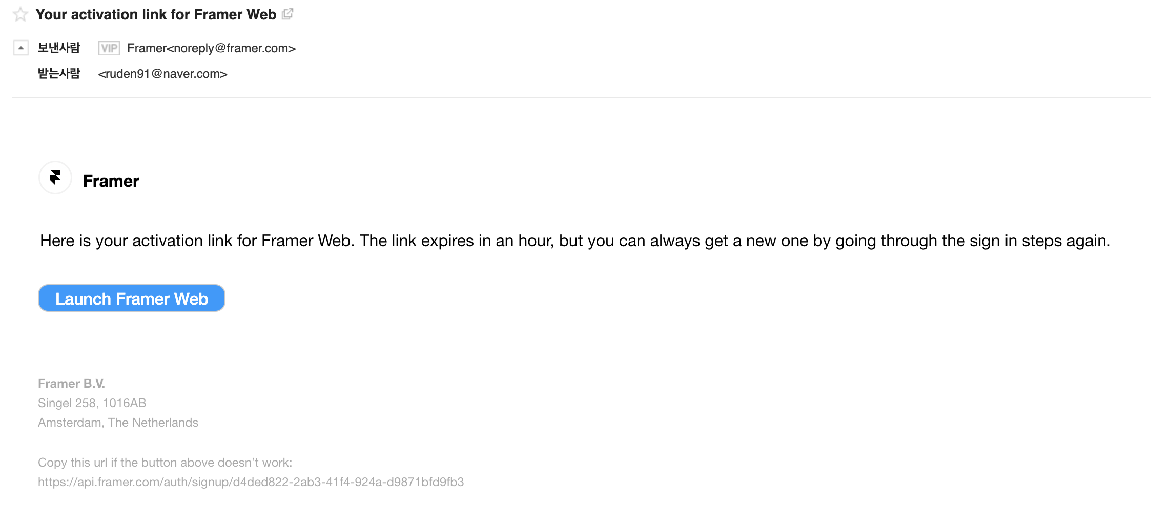 이메일로 회원가입을 하면 아래와 같이 이메일 인증 메일이 오게 됩니다. 이메일을 확인하여 해당 이메일의 Launch Framer Web을 누르고 프레이머를 실행해주세요!