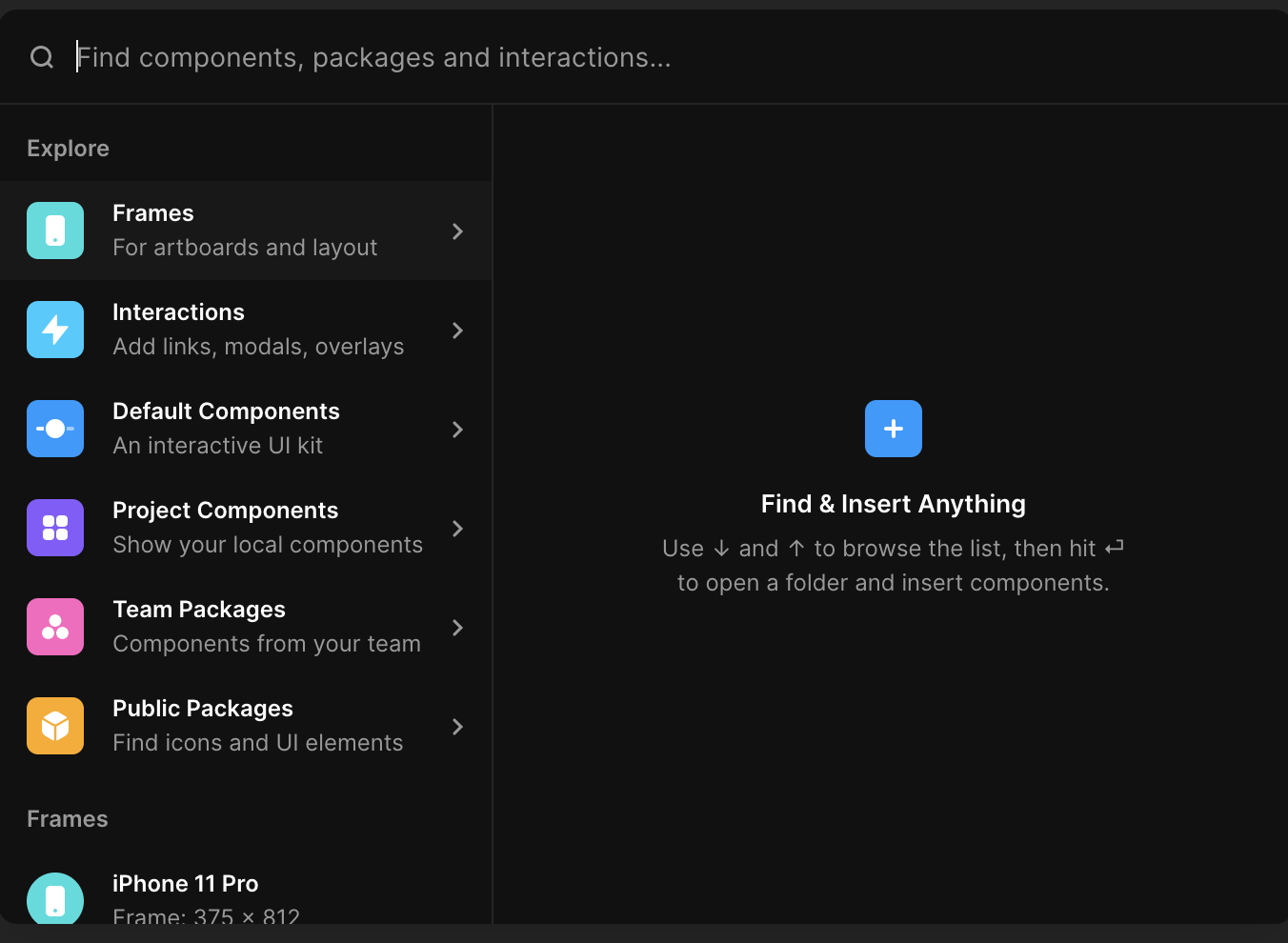삽입 버튼을 누르면 원하는 아이템을 검색하는 검색창이 등장하는데 저희는 디바이스 레이어를 추가할 거니까 Explore에 Frames를 클릭합니다.