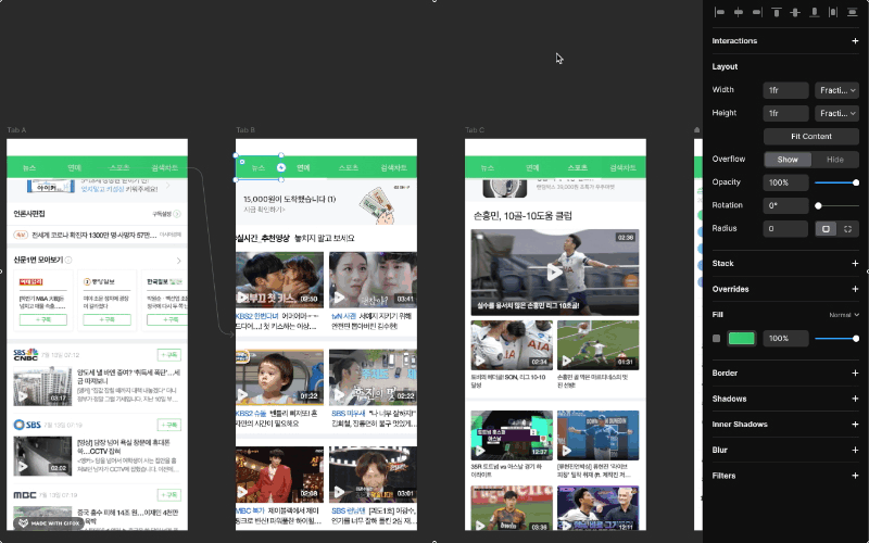 Tab A 레이어에 매직모션을 적용한 것처럼 Tab B 레이어의 뉴스 탭에 동일하게 매직모션을 적용하겠습니다. 방법은 동일하고 Target을 Tab A로 지정해주시면 됩니다.