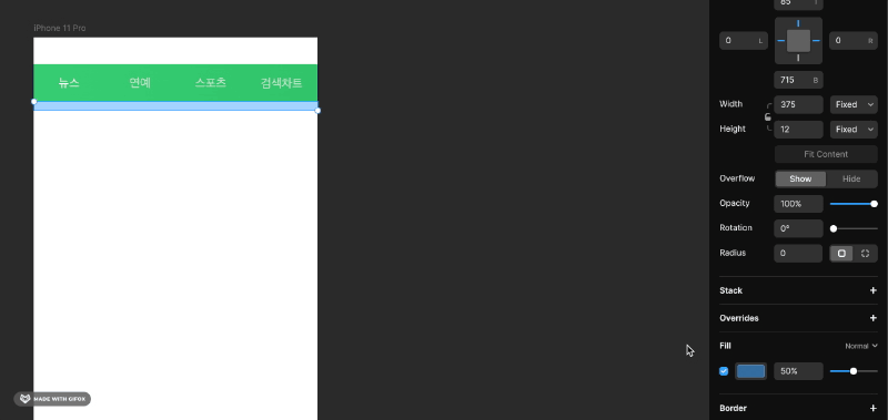 활성화 탭에 활성화 효과를 주기 위해 프레임을 추가합니다. 아이템 크기에 맞춰서 프레임을 추가합니다. 컬러는 #fff, 높이값은 4px입니다.