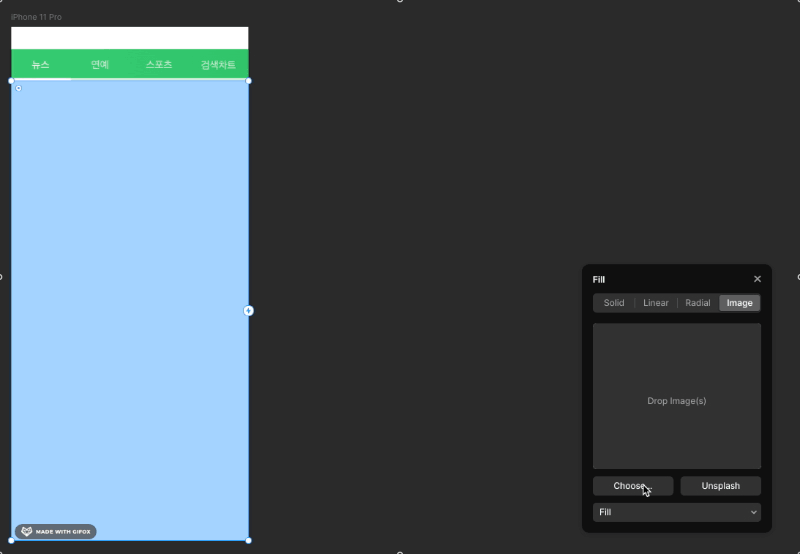 프레임의 여백을 없애기 위해 Layout 패널에 있는 Width와 Height 속성을 Fixed에서 Fraction로 변경합니다. 부모 스택 사이즈에 맞춰서 여백없이 모두 채워집니다.