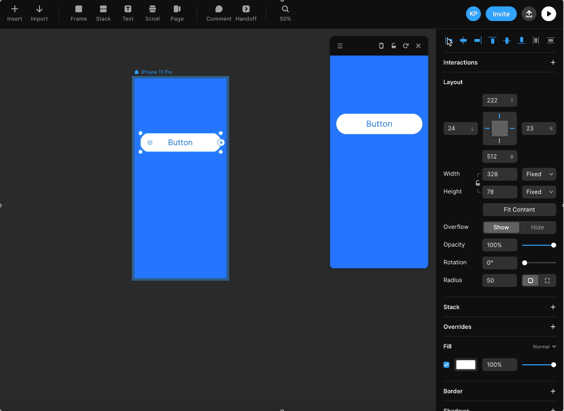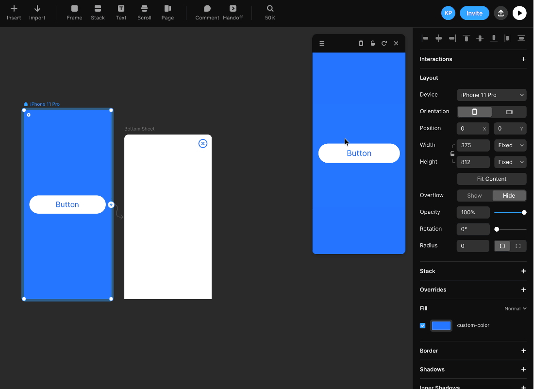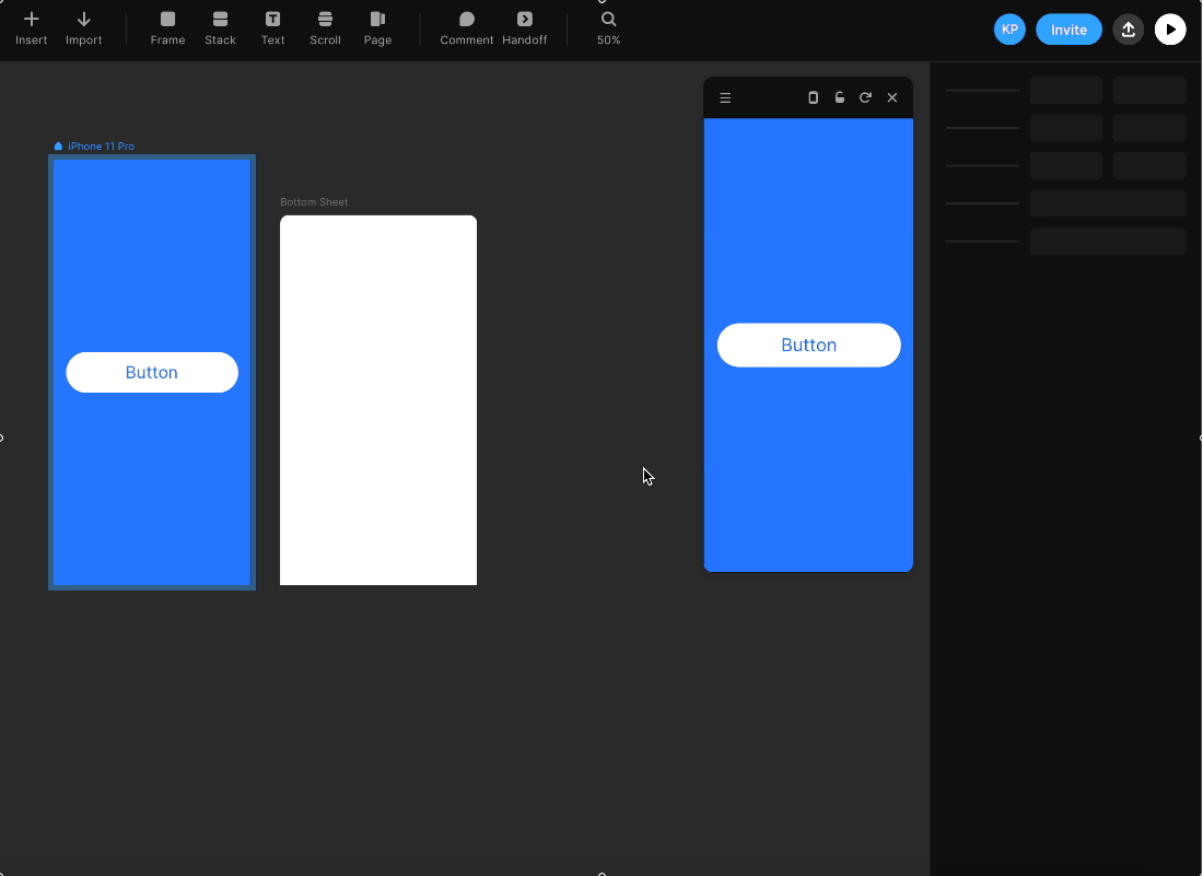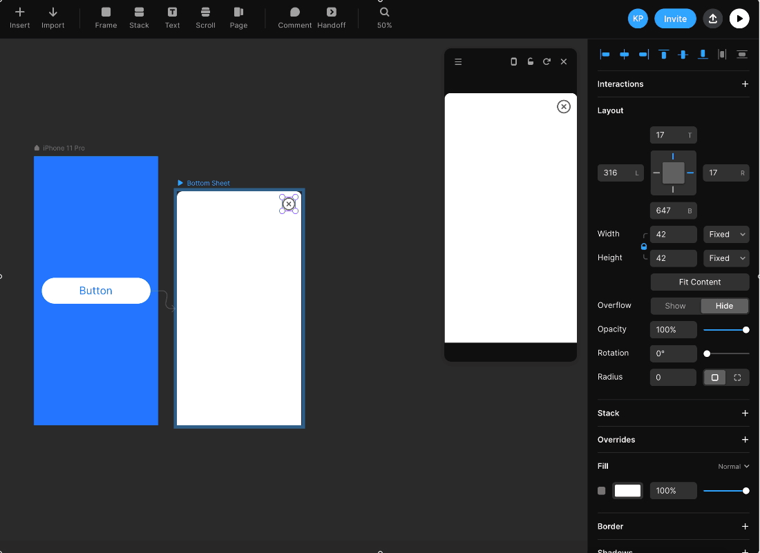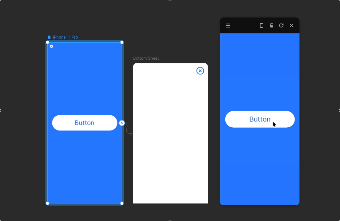 이제 매직모션을 추가하겠습니다. 버튼을 클릭한 후 Interactions -> Tap -> Overlay 그리고 Target을 저희가 추가한 Sheet로 연결합니다. 매직모션을 추가하면 우측 이미지와 같이 구동됨을 확인할 수 있습니다.