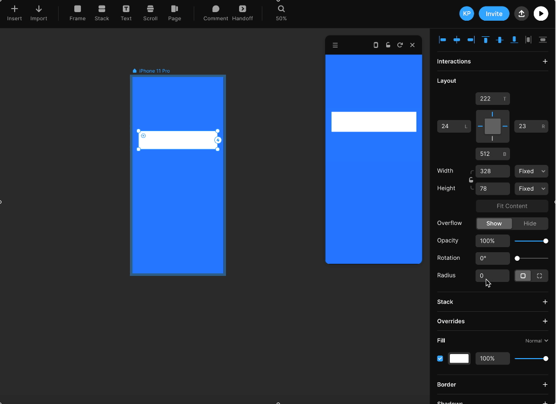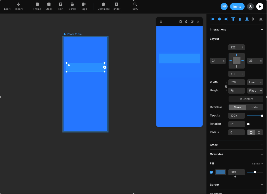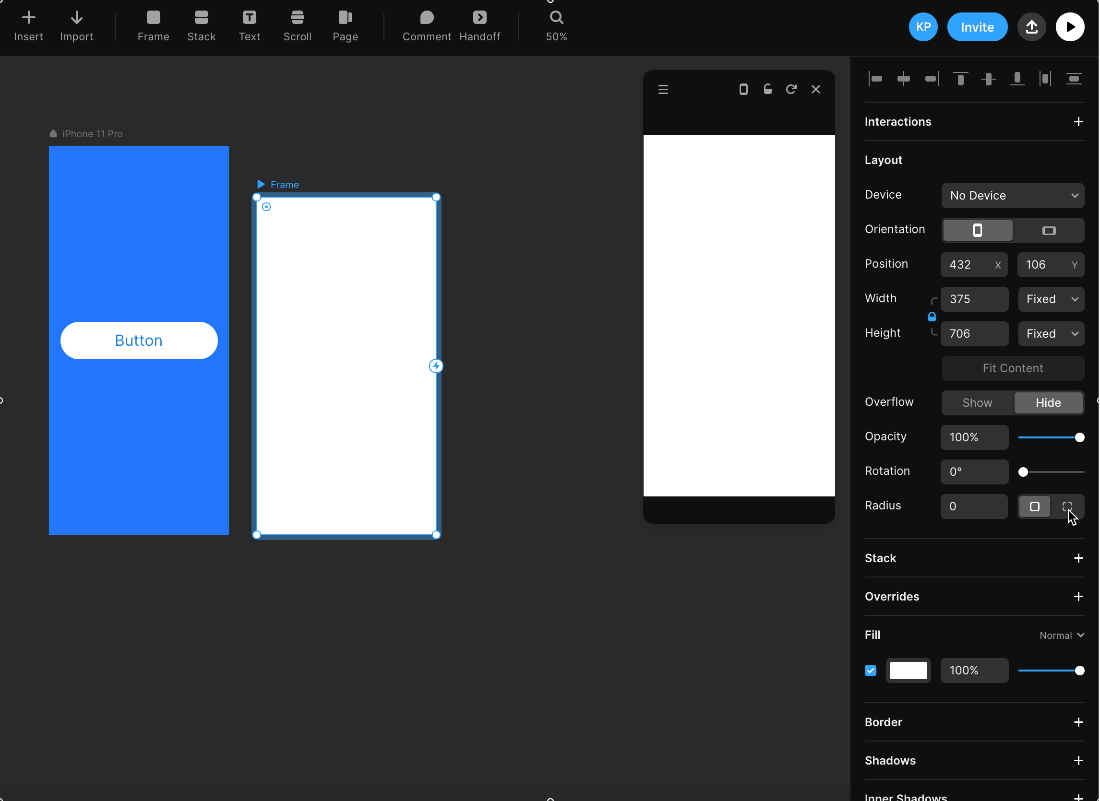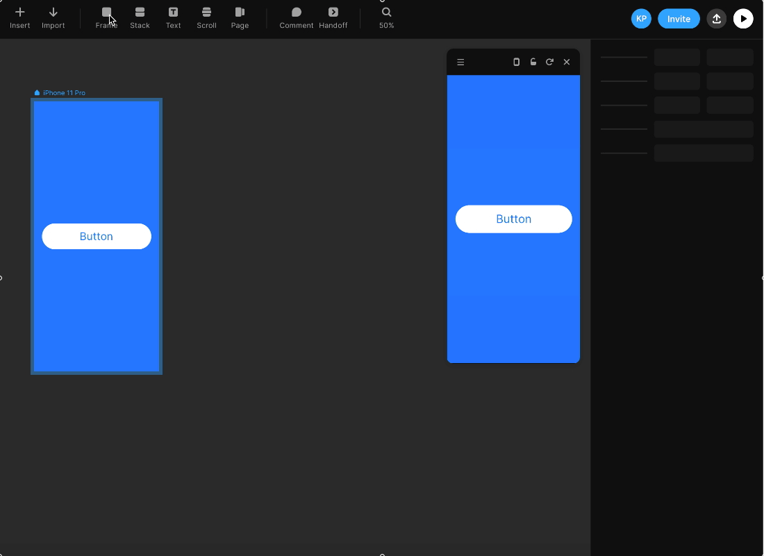 이제 매직모션을 추가하겠습니다. 버튼을 클릭한 후 Interactions -> Tap -> Overlay 그리고 Target을 저희가 추가한 Sheet로 연결합니다. 매직모션을 추가하면 우측 이미지와 같이 구동됨을 확인할 수 있습니다.