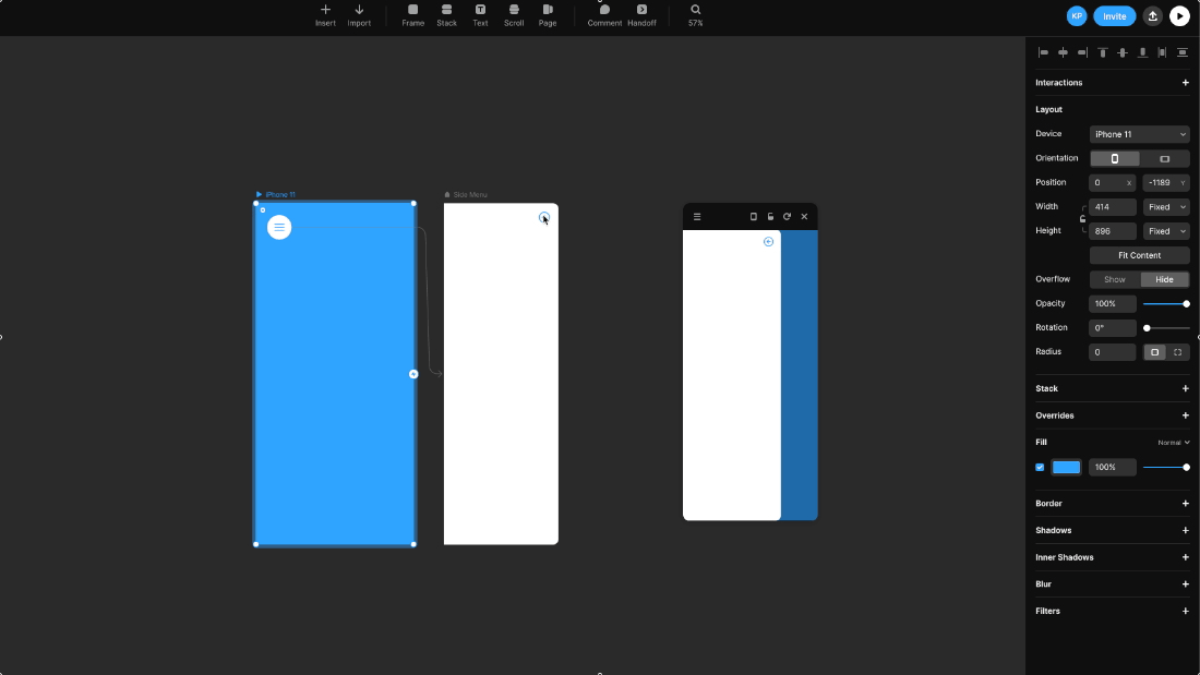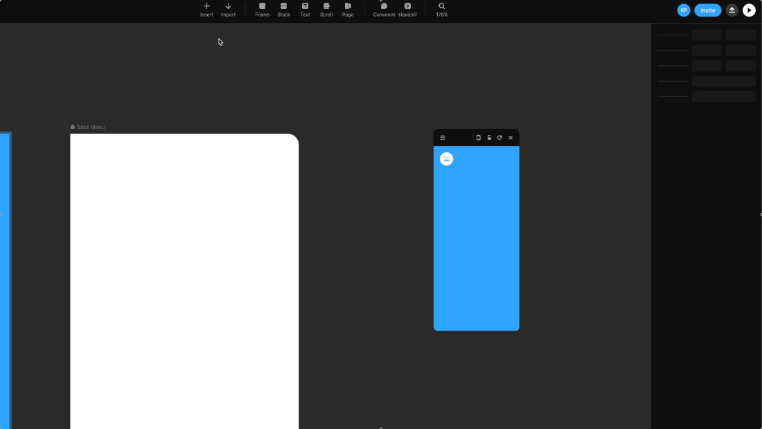 이번 포스팅에서는 Overlay Effect를 활용해서 굉장히 많이 사용되는 UI 요소인 사이드 메뉴(Side Menu)를 직접 구현해봤습니다. 대부분 웹이나 앱 서비스에서 사용하고 있는 만큼 프레이머에서 기본적으로 이렇게 간편하게 사용할 수 있도록 제공하고 있습니다.