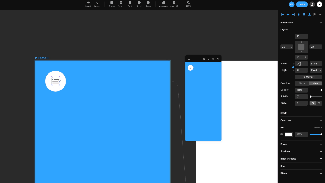 사이드 메뉴를 열기 위해 트리거 시켜줄 버튼을 추가하겠습니다. 저는 버튼 크기를 64px로 세팅하겠습니다. 디바이스 레이어의 좌측 상단에 배치해 주세요.