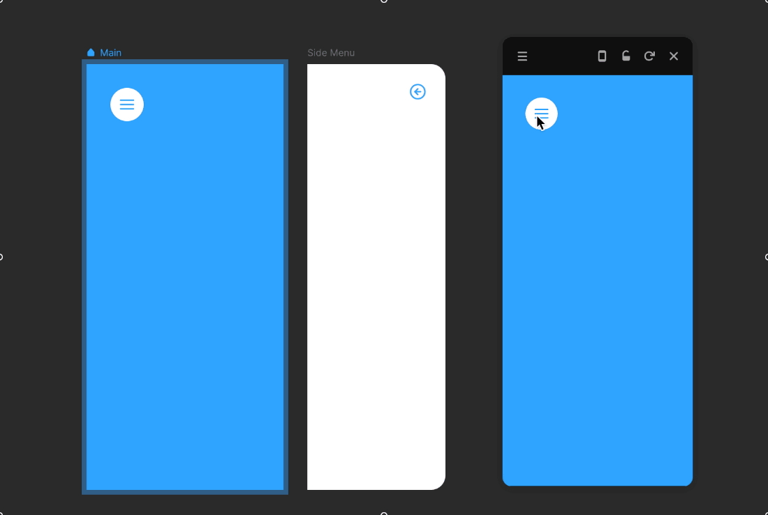 사이드 메뉴 트리거 버튼에 인터랙션을 추가합니다. 우측 컨트롤러에 Interactions -> Tap -> Overlay 그리고 타겟은 저희가 좀 전에 만든 사이드 메뉴 프레임을 연결시켜줍니다.