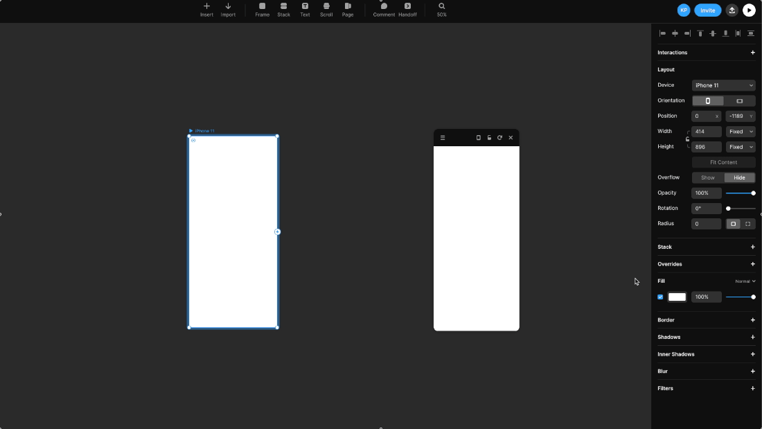 상단의 프레임을 누르고 원하는 디바이스 레이아웃을 추가해 주세요.