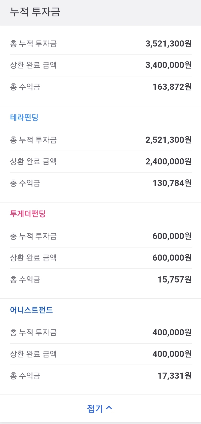 부실은 못 받는다고 치면 총 42,572원을 벌었다고 생각하면 될 것 같네요. 3,400,000원을 투자하고 벌어들인 수익금이라고 생각하면 괜찮나요? 어떻게 생각하시나요? (부실때문에 마음고생한 비용까지 계산하면 좀 부족한 듯... 다행히 수익금과 연체 비용을 제하면 원금 손실은 안난걸로 되는거네요..)