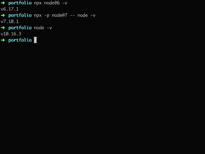 node 패키지는 nvm, nave 또는 n과 같은 노드 버전 관리 도구를 사용하지 않고도 서로 다른 노드 버전을 사용하여 노드 명령을 매우 쉽게 쓸 수 있는 툴입니다. 사용하는 방법은 간단합니다. 그저 npm@5.2.0 설치만 되어 있으면 됩니다!