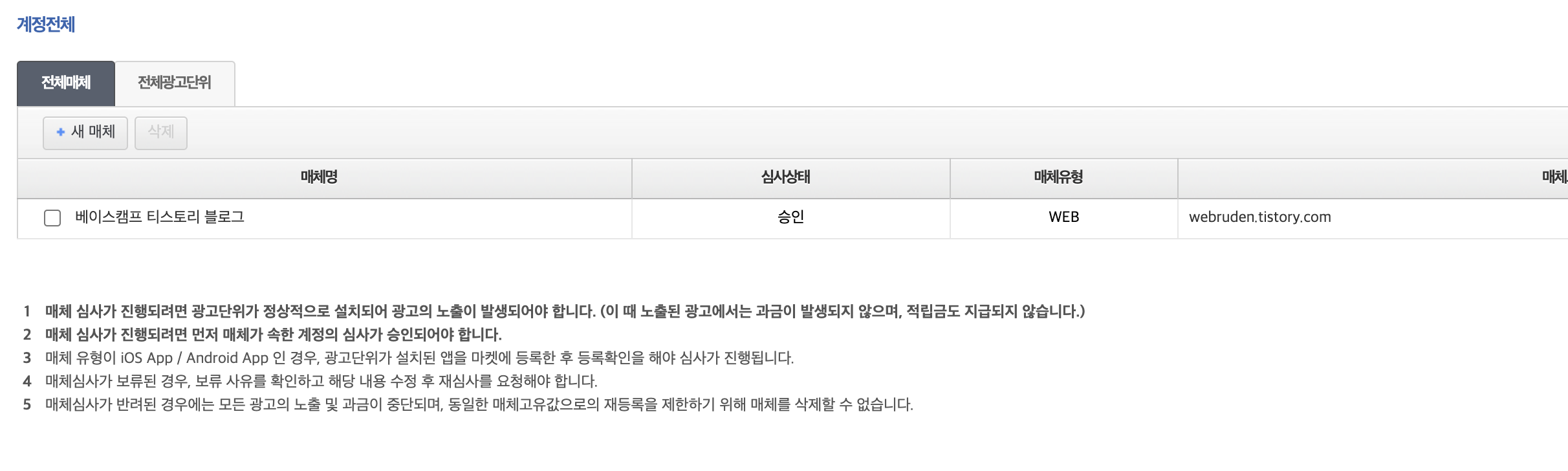 광고 관리 페이지를 들어가면 아래와 같이 전체 매체를 관리할 수 있는 부분을 확인할 수 있습니다. 전체 매체 탭 아래에 있는 새 매체 버튼을 눌러서 매체를 등록합니다.