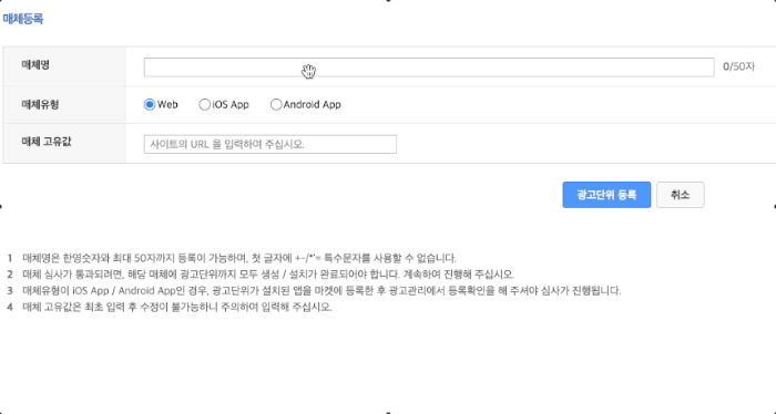 매체 등록 페이지에서 아래와 같이 매체 정보를 입력합니다. 매체명에 본인이 원하는 네이밍을 기입하고 매체 고윳값에는 사이트 URL을 넣어줍니다. 사이트 URL은 본인의 블로그 주소입니다.