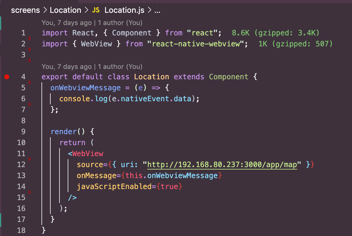 우선 웹뷰에서 카카오맵이 정상적으로 로드되었을 때 리액트 네이티브 앱으로부터 위치정보 데이터를 받기 위해 요청합니다. 아래 코드는 웹뷰에서 리액트 네이티브 앱에게 위치정보 데이터를 요청하는 전체 코드 예시입니다.