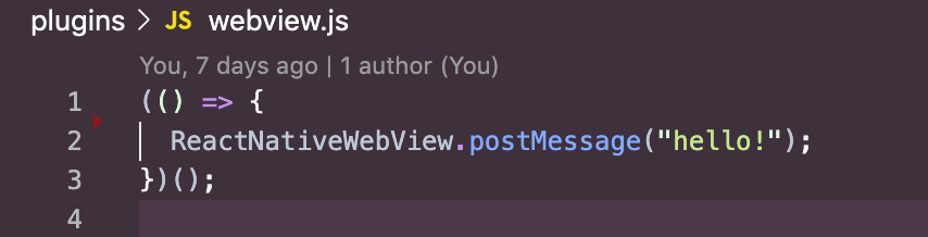 ReactNativeWebView.postMessage("hello!"); // ReactNativeWebView.postMessage를 사용해서 앱으로 값을 전달한다.