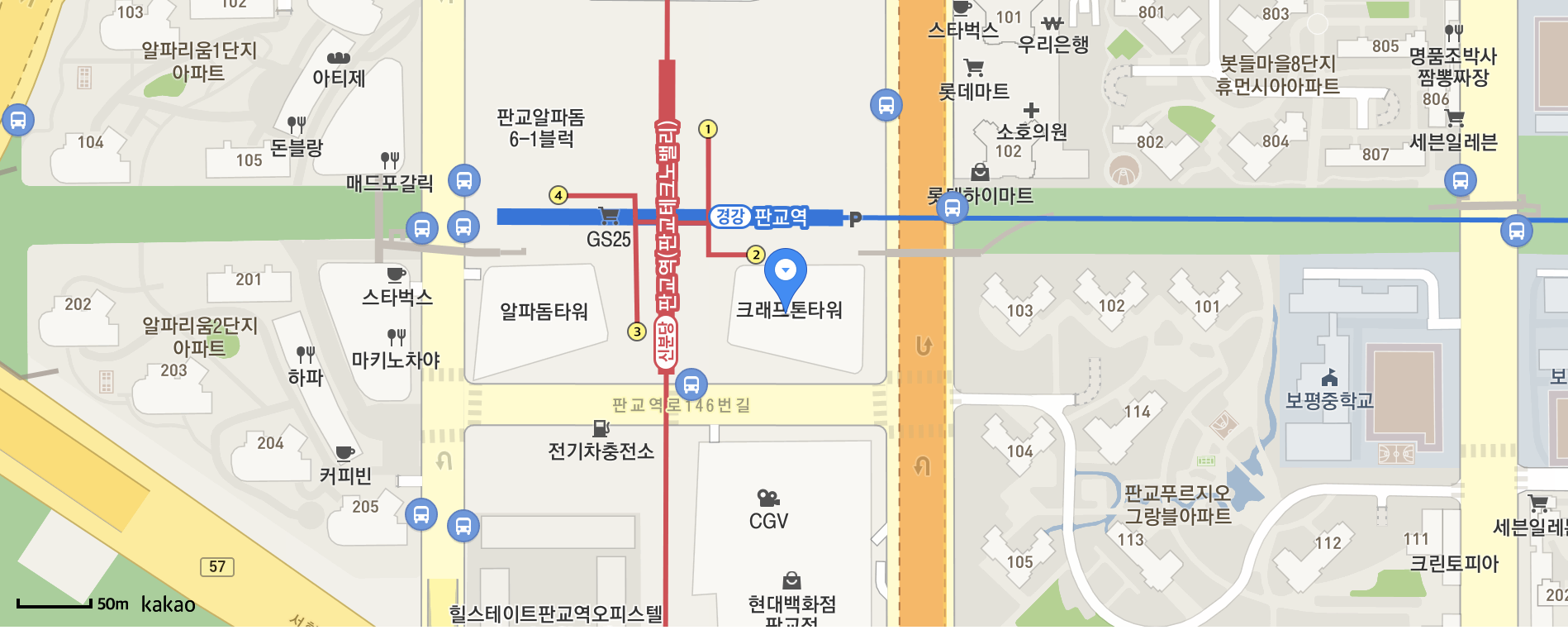 판교역은 신분당선·경강선 환승역으로 교통이 매우 편리함 (서울 강남역까지 지하철로 14분 소요) 본건은 판교역 및 현대백화점과 지상 1층, 지하 1층으로 직접 연결된 초역세권 빌딩