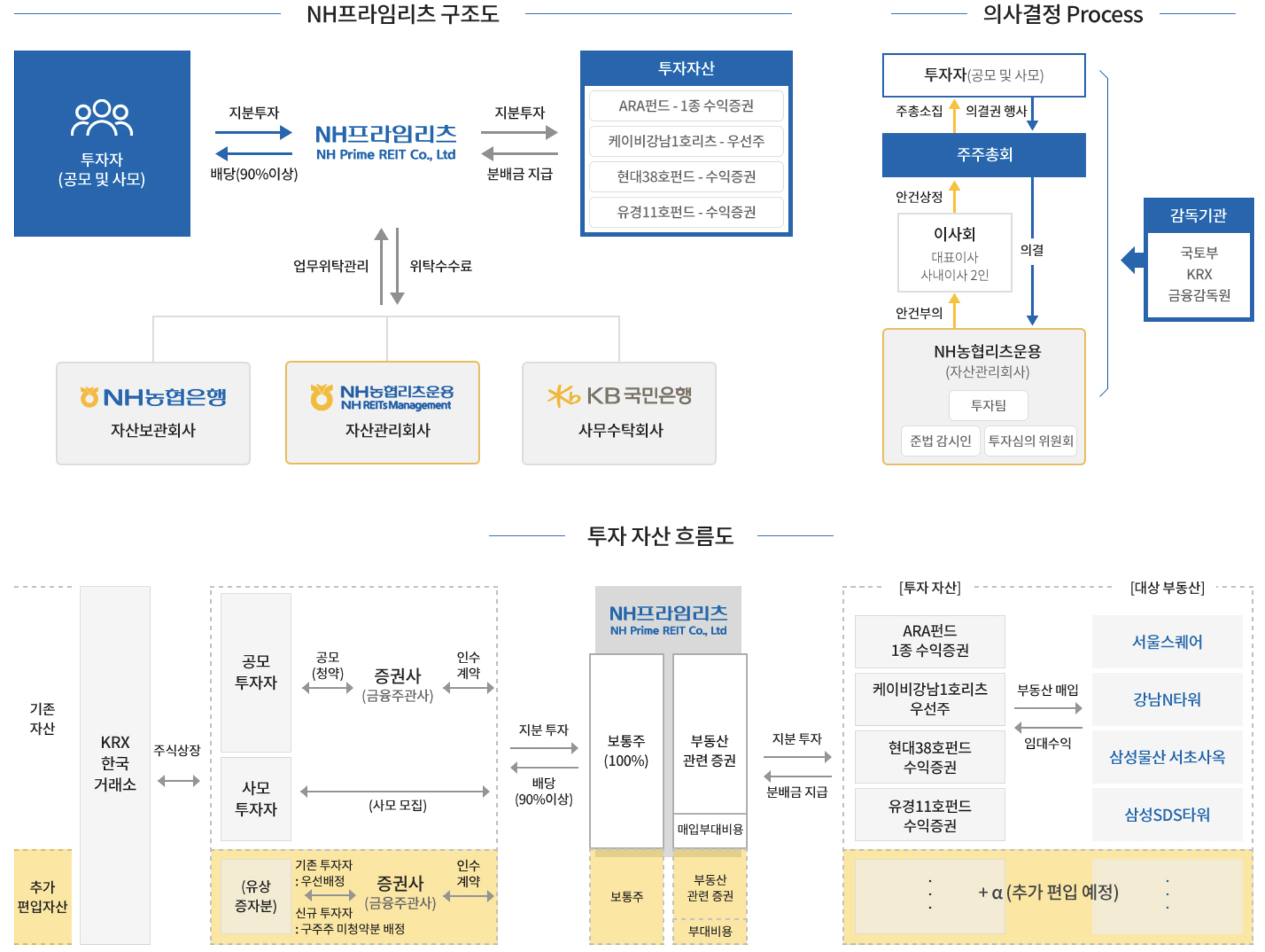 NH프라임리츠는 서울스퀘어와 강남N타워, 삼성물산 서초사옥, 삼성SDS타워 등을 기초자산으로 하고 있는 ARA펀드, 케이비강남1호리츠, 현대38호펀드, 유경11호펀드 등에 투자하는 재간접 투자형 리츠다. 이들 펀드에는 각각 0.15~0.21%의 보수가 발생한다.