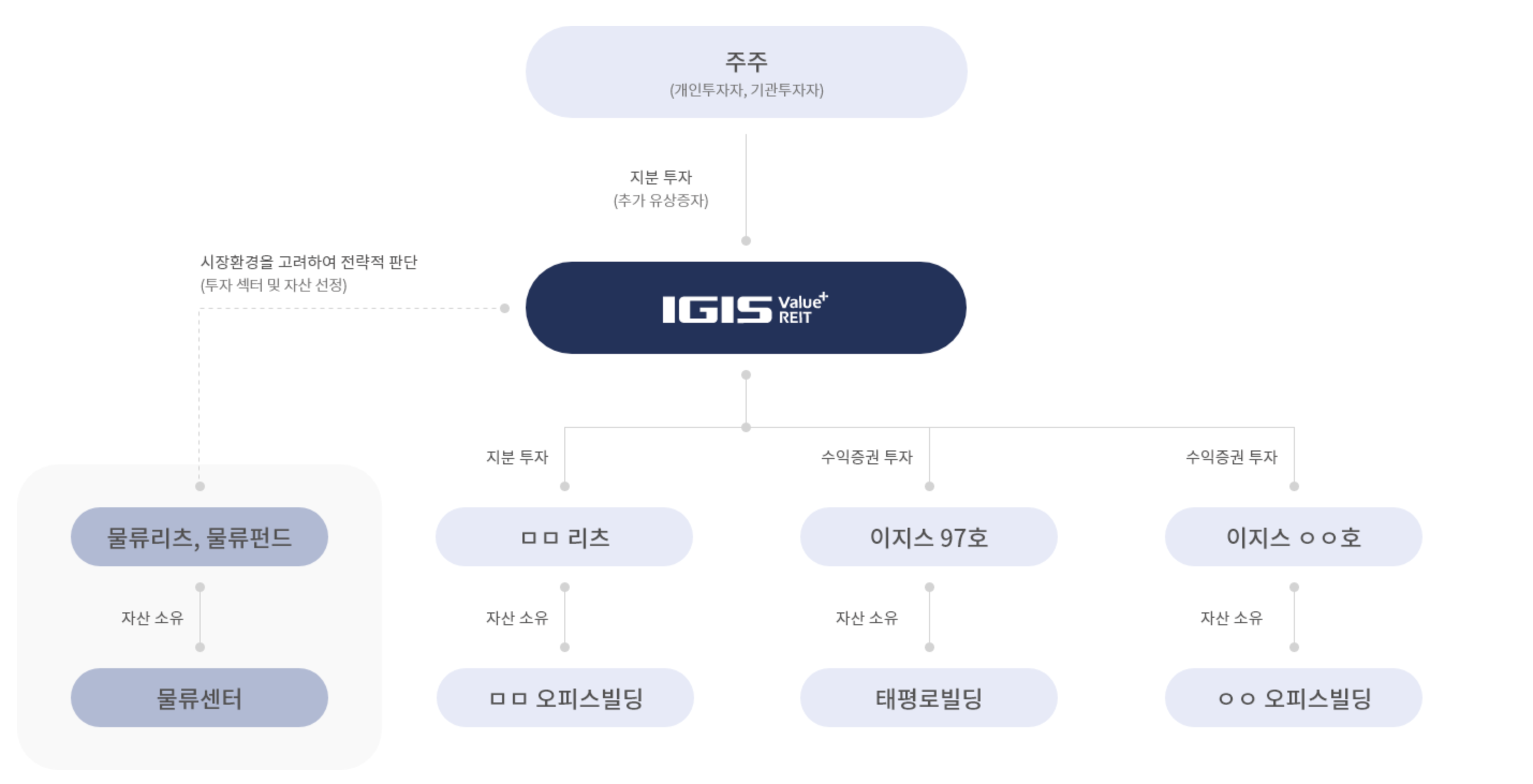 이지스밸류플러스리츠는 '태평로빌딩'을 보유한 '이지스97호'의 수익증권 99.9%를 매입(1,132억원)하여 실질적으로 태평로빌딩에 투자합니다. (다른 재간접 리츠/펀드(Fund of Fund)와 달리 절대적인 지분을 보유하고 있어 부동산에 '직접' 투자하는 것과 흡사한 투자 방법입니다.)