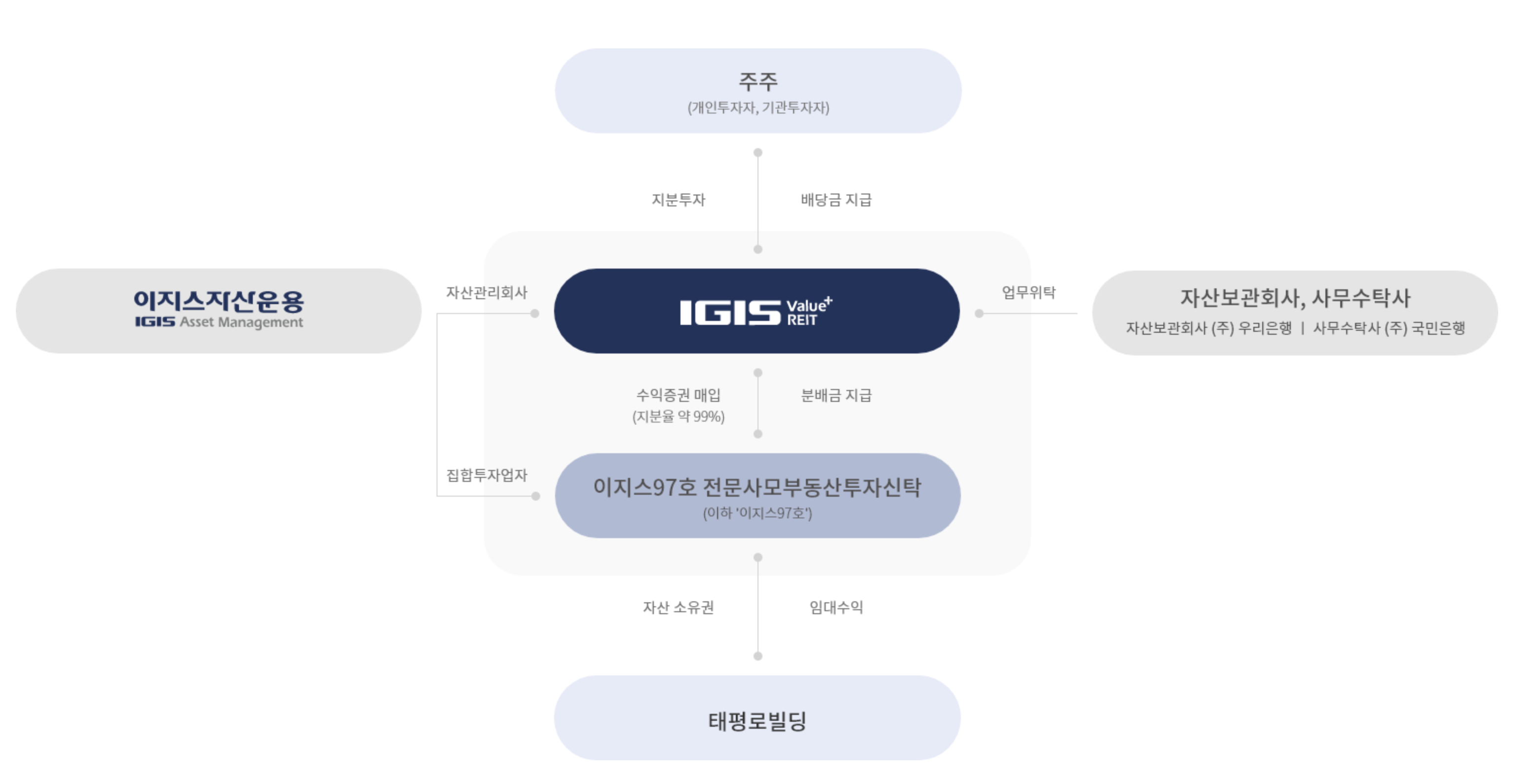 이지스밸류플러스가 공모를 통해 자기자본을 조달 후, '태평로빌딩'을 보유한 '이지스97호'의 수익증권을 매입하는 구조입니다.
