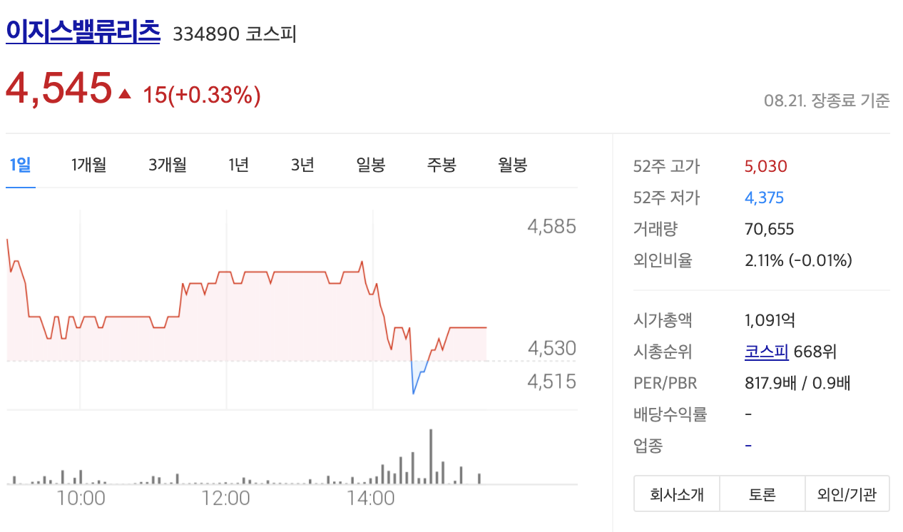 이지스밸류리츠는 현재 주가가 4,545원으로 공모가(5,000원)을 하회하고 있는 모습을 보이고 있습니다. 신규 입성자는 공모로 참가한 투자자보다 저렴한 가격인 4,545원에 진입할 수 있는 좋은 기회로 보입니다.