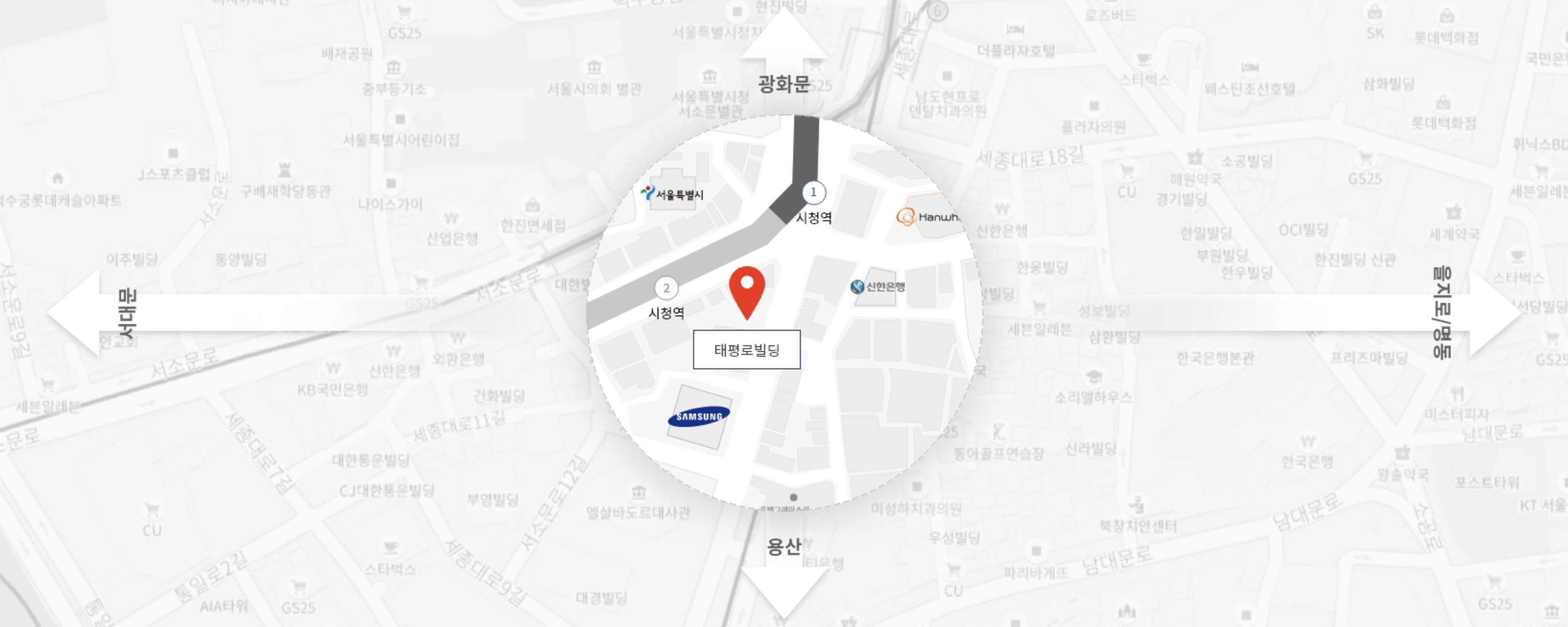 태평로빌딩은 전통적인 대기업 및 금융회사 선호 지역인 CBD(중심업무지구)내에서도, 다양한 임차수요를 흡수 가능한 시청권역에 위치하고 있습니다. 500m 거리 내에 다수의 대기업, 국내·외 금융회사, 다국적 기업 등이 위치하고 있으며, 해당 기업 및 관계사에서 발생하는 임차수요가 풍부합니다. 인근에는 프라임(Prime)급 업무시설과 노후화된 소형 빌딩이 혼재하여, 프라임(Prime) 오피스에 대한 프리미엄(Premium)이 존재합니다. 서울 시청 및 다수의 주한외교공관 등 국내·외 공공기관과 시청 광장, 덕수궁, 숭례문 등의 관광·문화시설과 인접하여 쾌적한 업무환경을 제공해 주고 있습니다.