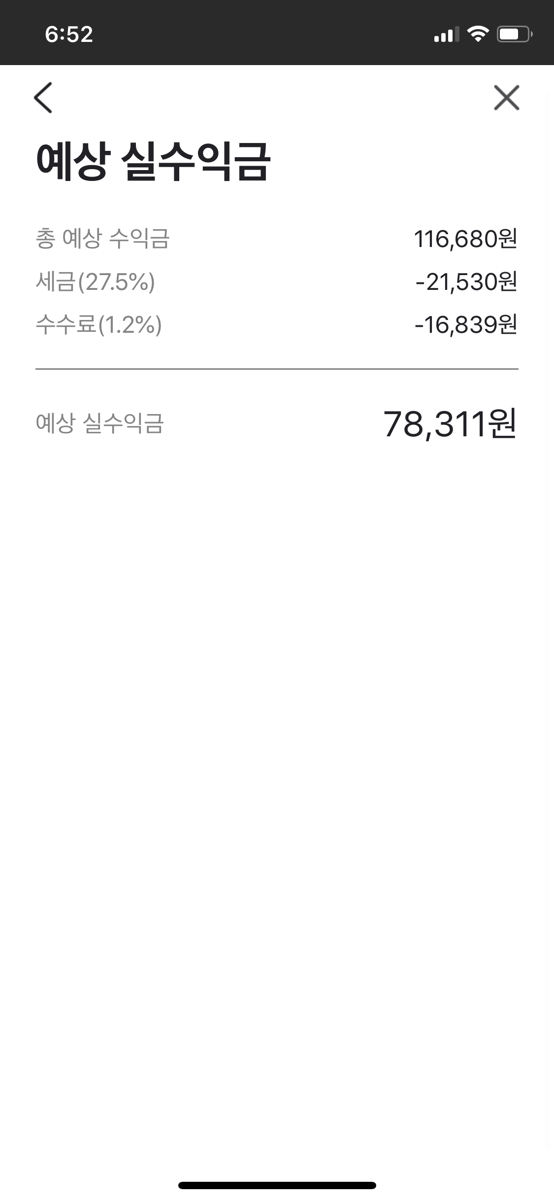 전체 투자 누적 투자금은 2,460,000원이고 현재까지 상환완료된 투자금은 1,797,504원입니다. 연수익률은 7.74%정도 되고, 누적 수익금은 세전으로 88,928원입니다. 세전으로 표기하고 있는 것이 함정입니다. 왜냐면 세금을 정말 어마어마하게 많이 떼어갑니다. 아래 예상 실수익금 이미지를 보시면 세금이 무려 27.5%고, 거기에 추가적으로 수수료 1.2%를 뗴어갑니다. 제가 알기로 수수료는 플랫폼 중개 수수료로 알고 있습니다. 그래서 결론적으로 2,460,000원의 투자금 총 예상 실수익금은 78,311원이죠.