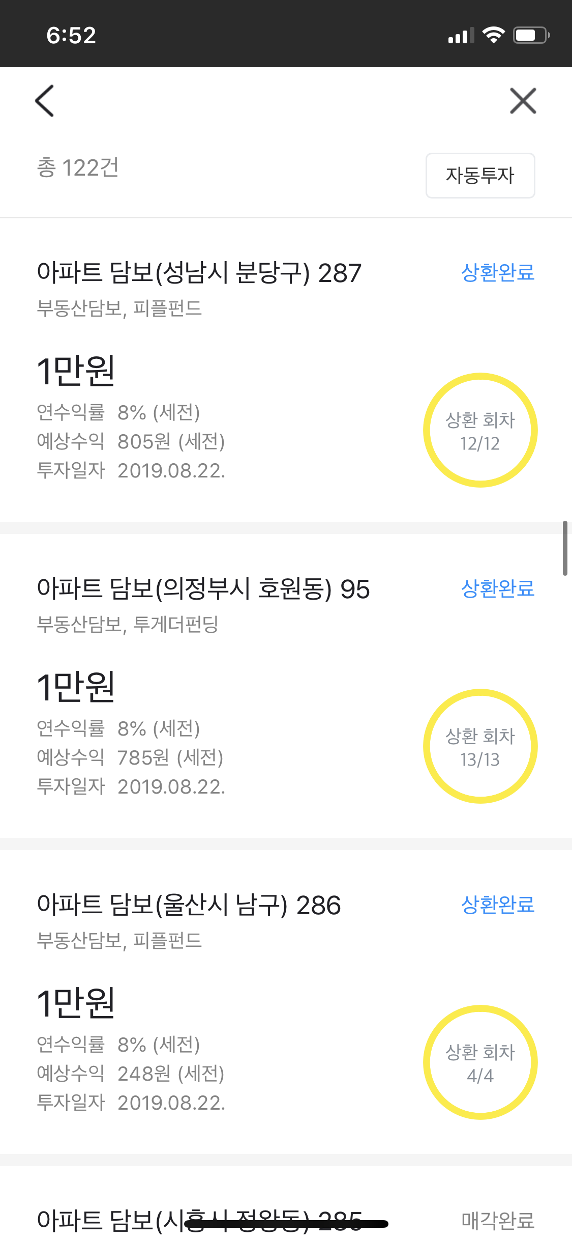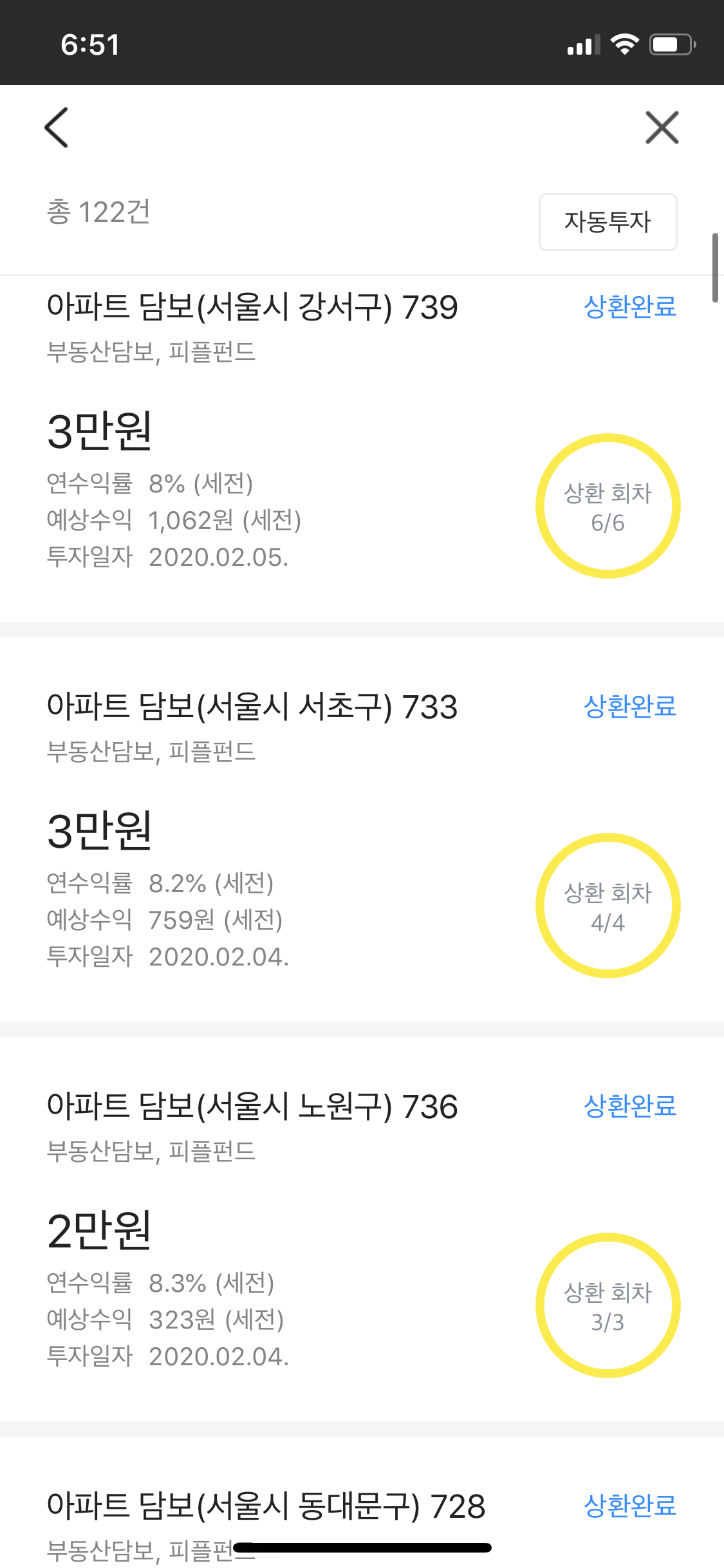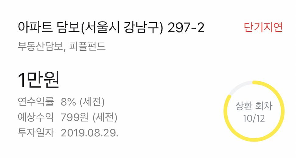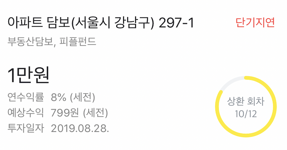 토스 부동산 소액투자처럼 연체는 없었을까요? 하지만 역시나 연체가 발생되고 있는 상품들이 있었습니다. 하지만 이전에 토스 부동산 소액투자와 다른 점은 부동산 연체가 아닌 부동산담보 대출 (피플펀드) 투자 건이라 비교하기에는 조금 차이가 있습니다. 그리고 토스 부동산 소액투자에서 겪었던 경험을 발판삼아 분산투자를 진행한 결과 단기지연이긴 하지만 손실로 처리하고 2만원의 손실밖에 발생하지 않았습니다.