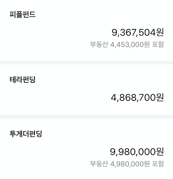 카카오페이 투자 가능 금액을 확인했을 때 어디서 많이 본듯한 투자 상품 제공사 친구들이 보입니다. 피플펀드, 테라펀딩, 투게더펀딩? 역시 카카오페이도 토스 소액투자와 같이 단순히 이 투자 상품 제공사를 연계해주는 플랫폼에 불과했습니다.