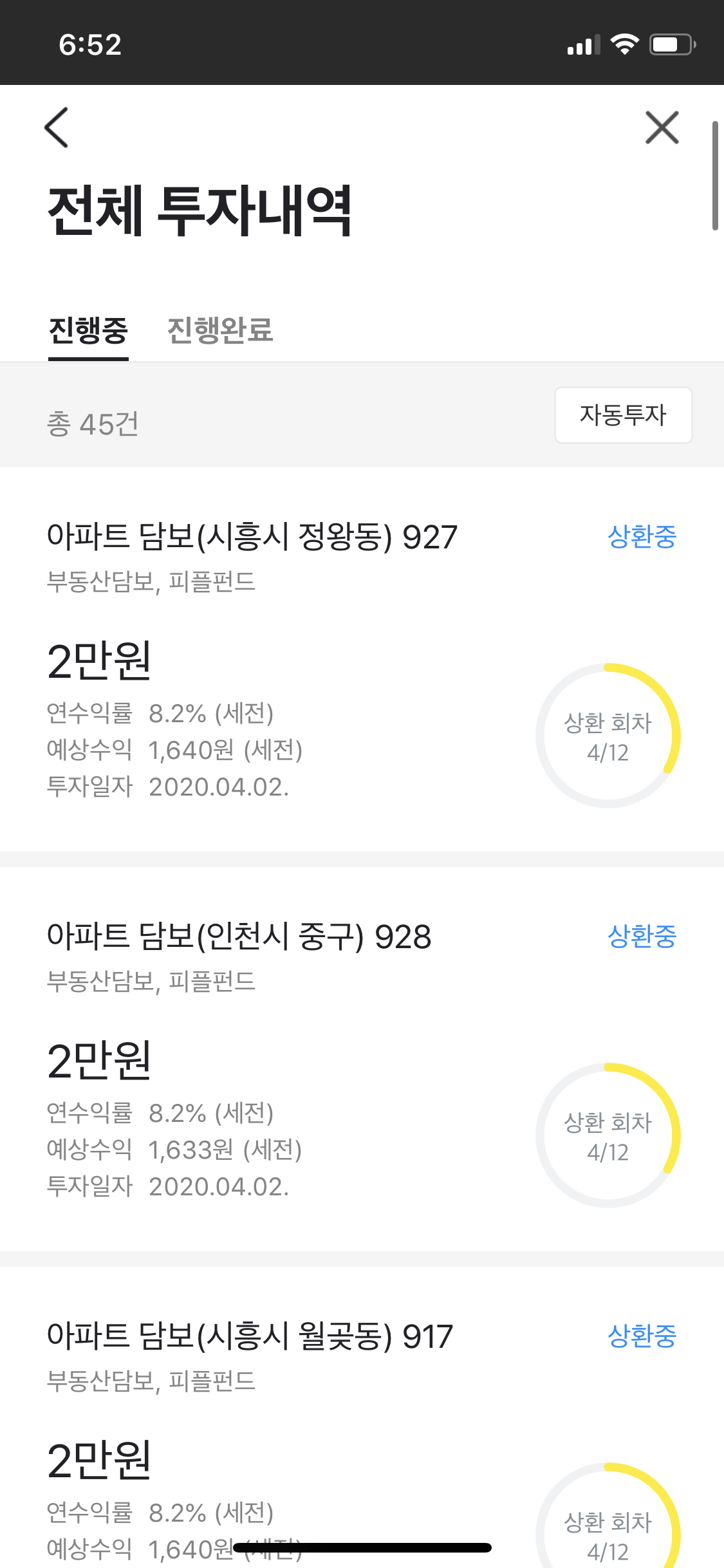 아래처럼 분산투자를 진행했는데 정말 투자상품의 종류도 다양하네요. 아파트 담보 대출부터 시작해서 개인신용 분산투자, 부동산 투자상품 등 엄청 많죠. 하지만 여기서 보시면 카카오 부동산 소액투자 리스트에는 부동산 소액투자만 존재하는 것이 아닙니다. 피플펀드에서 제공하고 있는 P2P 신용투자 상품들도 엄청 많습니다. 개인적으로 느낀 점은 부동산 투자 상품보다 P2P 신용투자(피플펀드)의 투자상품들이 훨씬 많았다는 점입니다.