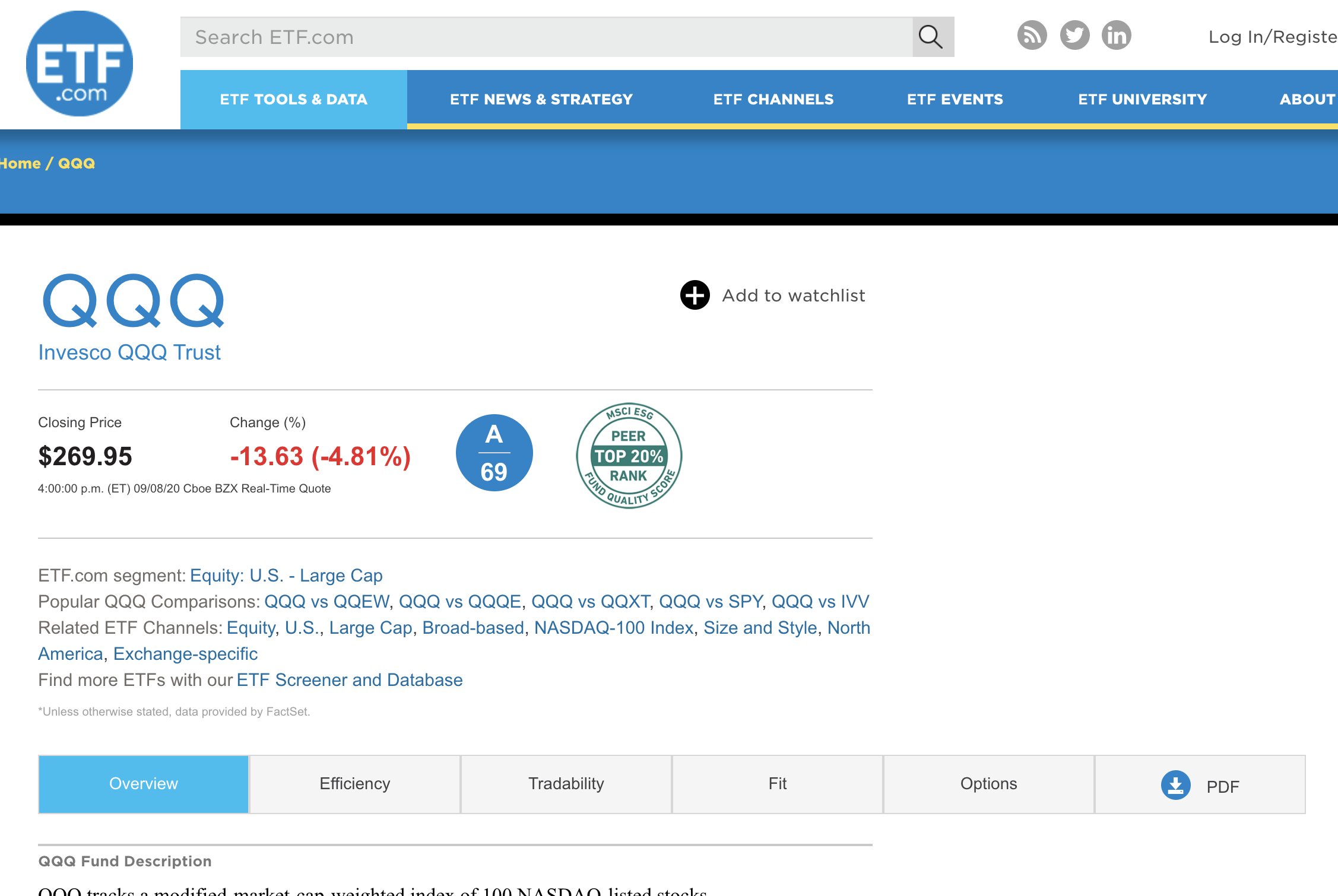etf.com에서 상단의 검색바에 찾으려는 ETF 상품의 이름을 검색하면 해당하는 ETF의 정보를 찾을 수 있습니다. 저는 예시로 QQQ를 검색해 보겠습니다.