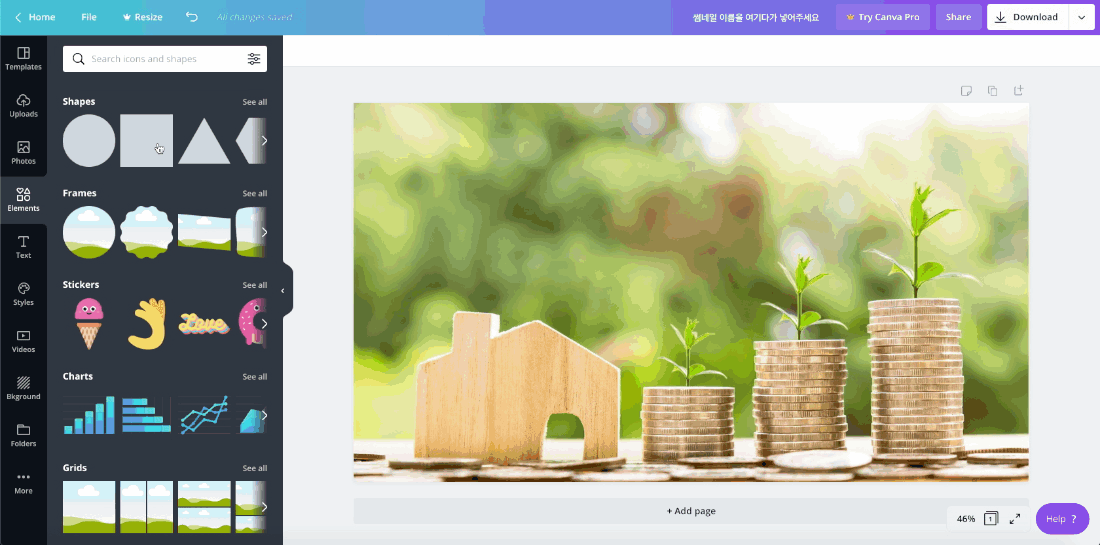 썸네일의 필수요소인 이미지를 추가하도록 하겠습니다. Canva의 장점중 하나는 무료 이미지를 이렇게 간편하게 검색하고 추가할 수 있다는 점입니다. Pro 버전을 사용하면 좀 더 양질의 이미지를 사용할 수 있으니 좀 더 고퀄리티의 이미지를 원하시는 분들은 Pro 버전을 선택해도 좋을 것 같습니다.