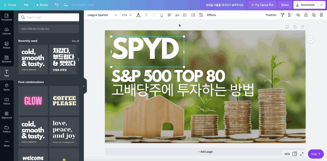 좌측 텍스트에서 원하는 폰트를 선택하고 템플릿에 텍스트를 넣어봅시다. 아래 예시처럼 저도 텍스트를 작성했습니다.
