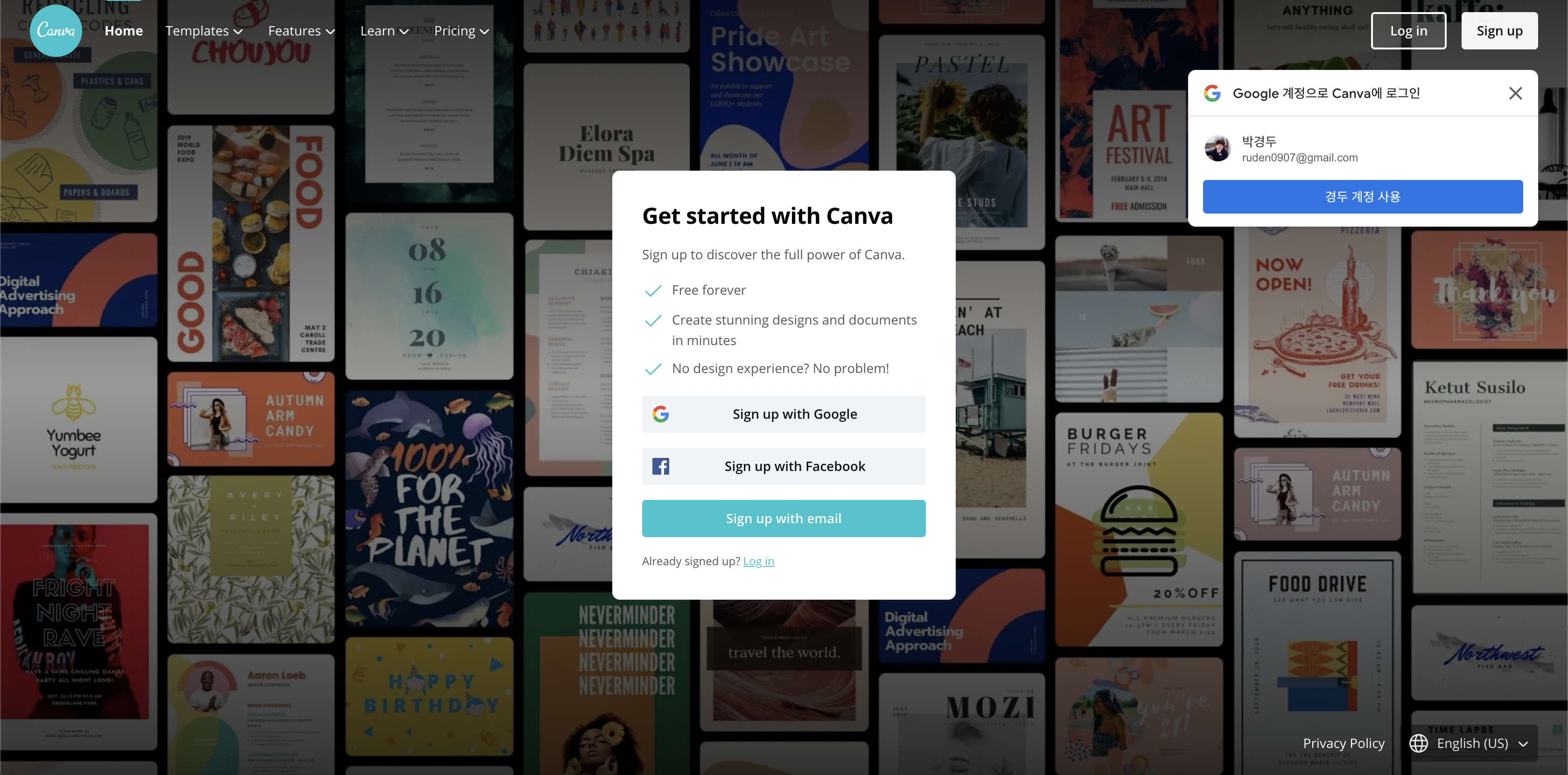 우선 Canva 웹사이트로 들어갑니다. Canva 사이트 링크를 모르신다면 여기를 눌러주세요.