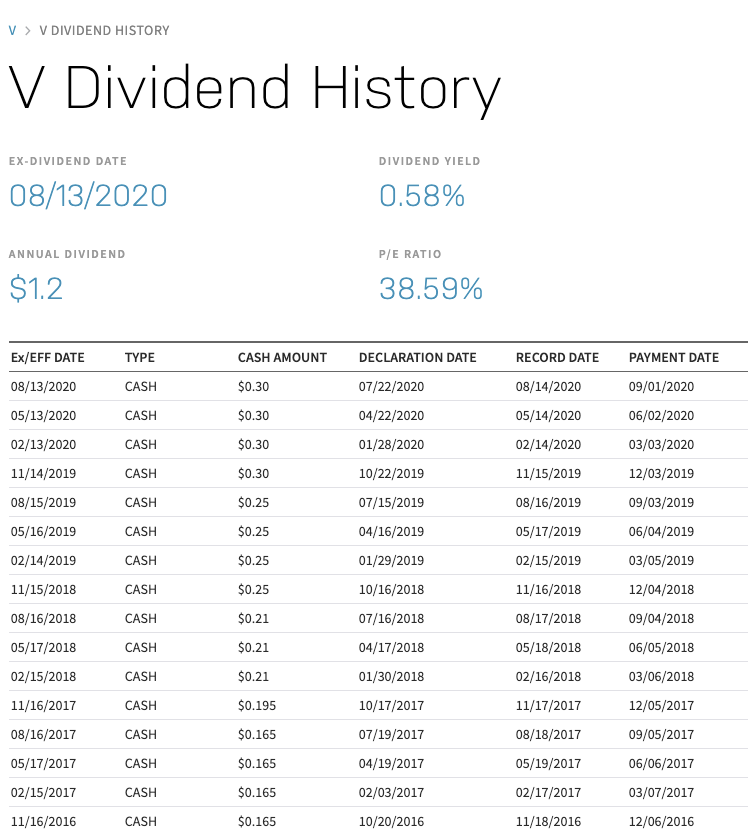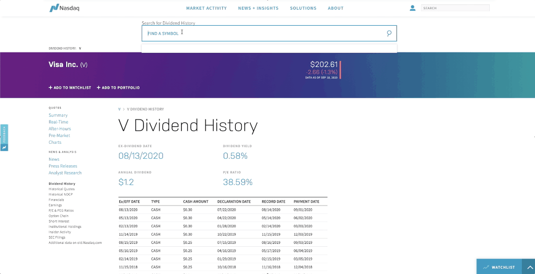 아래와 같이 오른쪽 Find a Symbol에 찾을 주식의 Symbol을 기입해주세요. 저는 예시로 비자(Visa, V)를 검색하도록 하겠습니다. 아래는 비자의 배당정보를 검색하는 예시입니다.