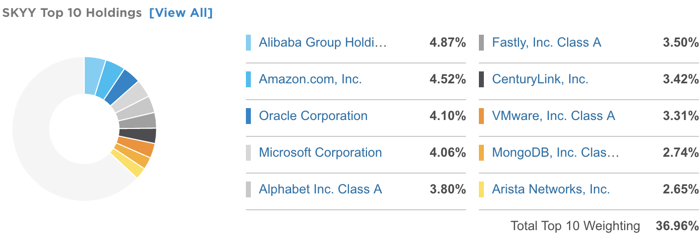 SKYY ETF는 클라우드 테마로는 최초로 상장된 ETF입니다. SKYY는 Infrastructure as a Service(iaas), Platform as a Service(paas) and Software as a Service(saas) 3개 그룹에 속해있는 클라우드 컴퓨팅 주식들을 추종하고 있습니다. 클라우드 컴퓨팅 분야에서 영향력이 강한 대형 기술주들(알리바바, 아마존, 오라클, 마이크로소프트, 구글 등)을 포함하고 있는 것이 특징입니다.