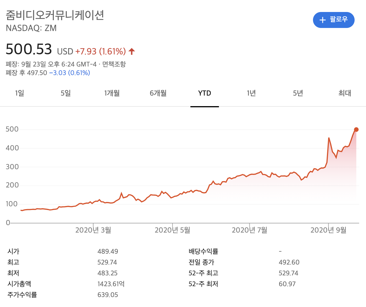 최근에 코로나 19로 인해 재택근무가 많아지면서 Zoom이 굉장히 많이 떠오르고 있죠? 그에 따라 CLOU, WCLD ETF에서의 비중이 굉장히 높아졌다고 판단할 수 있습니다.