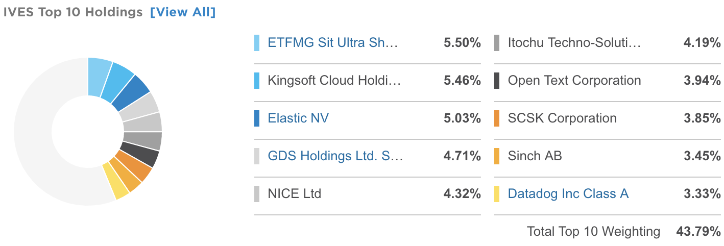 IVES ETF는 클라우드 인프라와 기술과 관련된 글로벌 중소기업들에 초점을 맞춘 ETF입니다. 클라우드를 통해 소프트웨어 배포를 주요 비즈니스로 하는 회사는 제외됩니다. 참고로 IVES ETF는 드론 산업에 투자하는 ETF인 "ETFMG Drone Economy Strategy ETF" 즉 약자로 IFLY ETF에서 투자 산업이 변경된 ETF입니다.