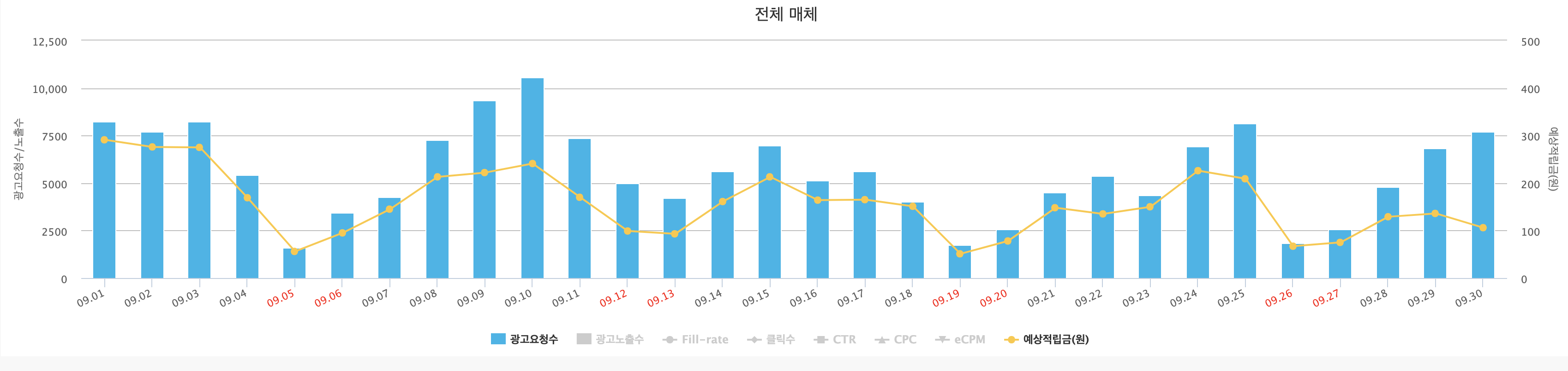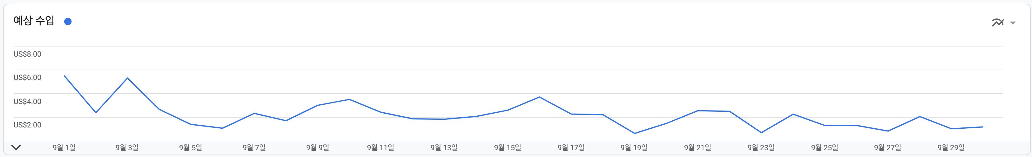 최고 수익률이 높은 날은 9월 1일(화요일) 5.51달러고, 최저 수익률을 보이고 있는 날은 9월 19일(토요일) 0.64달러를 기록하고 있습니다. 저의 블로그는 확실히 주말에 수익률이 약세인 모습을 보이고 있는데, 10월에는 주말 수익률 평균 3달러를 맞추는 것을 목표로 열심히 달려보도록 하겠습니다. 주말 평균 수익 3달러를 기록하면 평일에는 평균 5달러 정도 맞출 수 있겠죠?