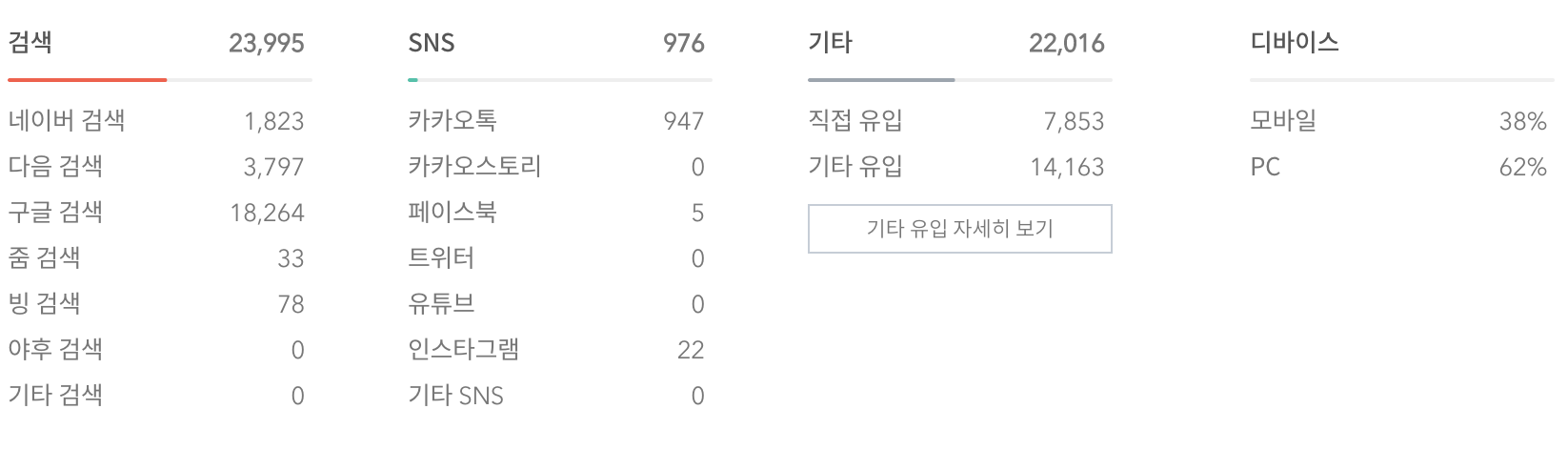 지난달에 비해서 네이버 검색 유입이 449건에서 1,823건으로 4배 이상 증가했고, 구글 검색 또한 11,359건에서 18,264건으로 7천건 이상 검색 유입량이 증가했습니다. 네이버 검색 유입이 안되어서 굉장히 골치아팠는데 이번달에 잘 뚫리면서 굉장히 높은 검색 유입량을 보여서 굉장히 뿌듯하네요. 카카오톡 416건에서 947건으로 무려 2배 이상 공유가 이뤄졌습니다. 예전에 구글 검색으로만 이뤄져있던 저의 블로그가 다양한 매체에서 검색이 되고, 공유가 된다는 점은 굉장히 큰 성장 포인트로 보입니다.